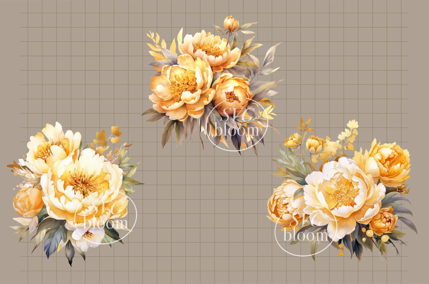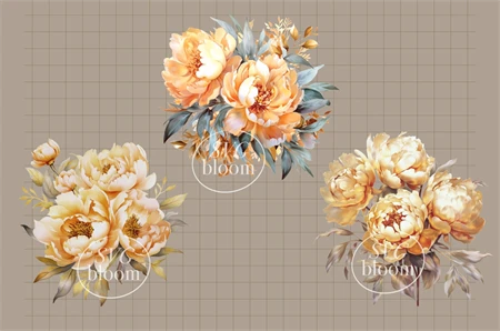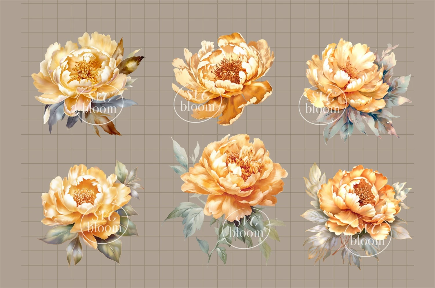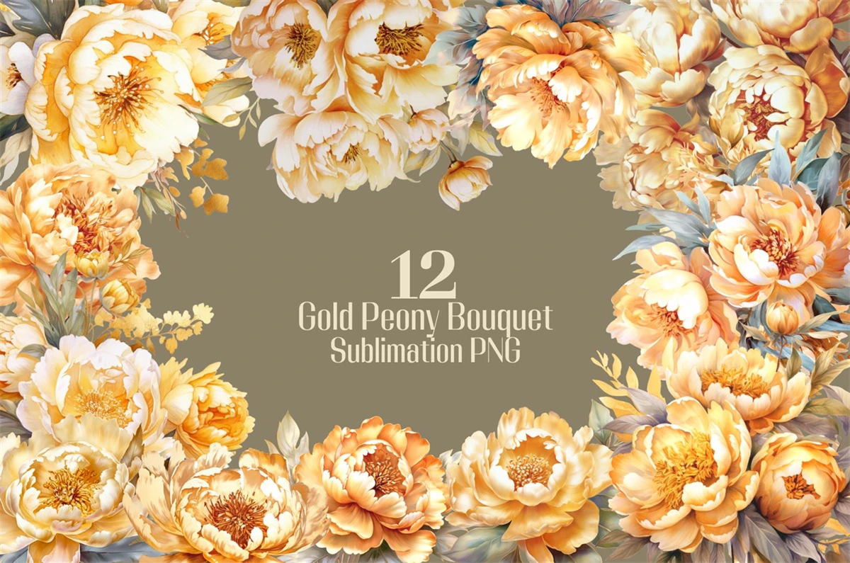 12 Gold Metalic Peony Flower Bouquet Sublimation PNG Clipart