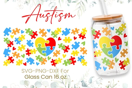 16oz Autism Puzzle Libbey Glass Can Svg, Hearts Svg, Autism