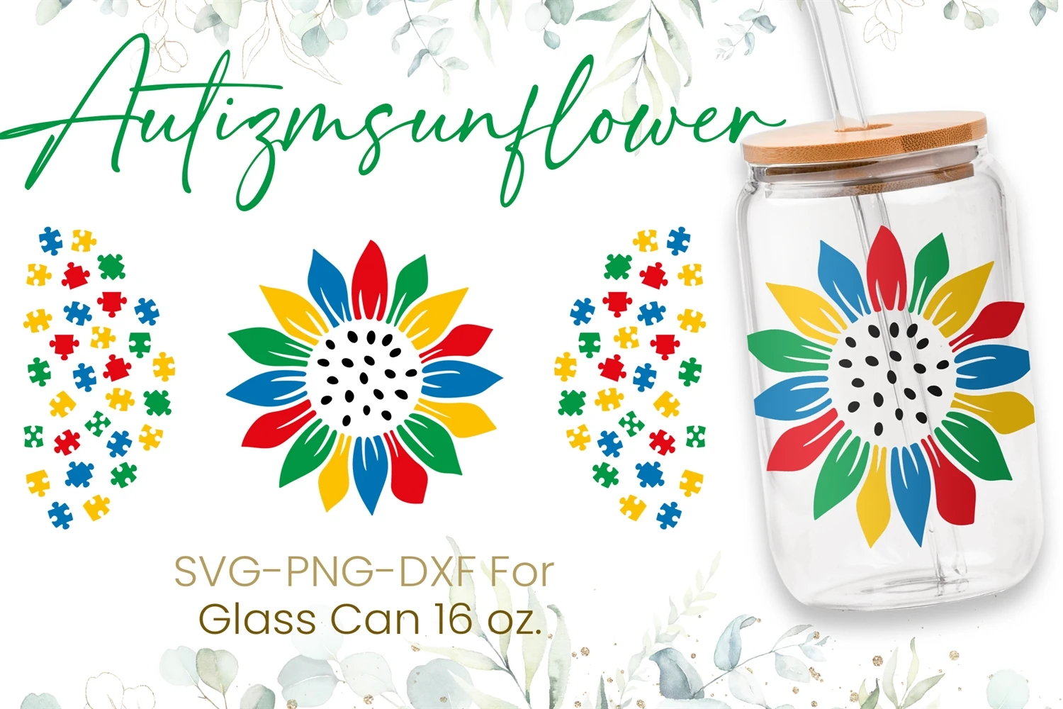 16oz Autism Sunflower Libbey Glass Can Svg,Butterfly Can Svg