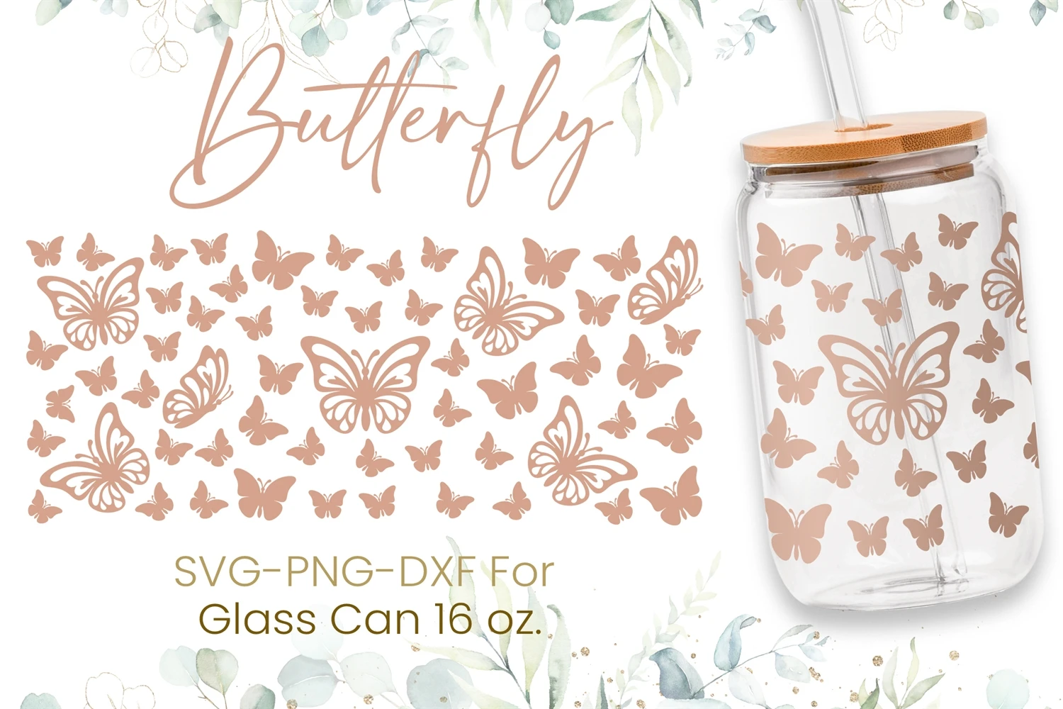 16oz Butterfly Libbey Glass Can Svg, Butterflies Glass Can