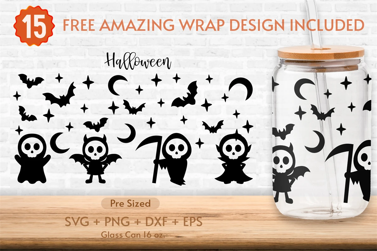 16oz Halloween Libbey Glass Can Svg, Grim Reaper Svg Bat Svg