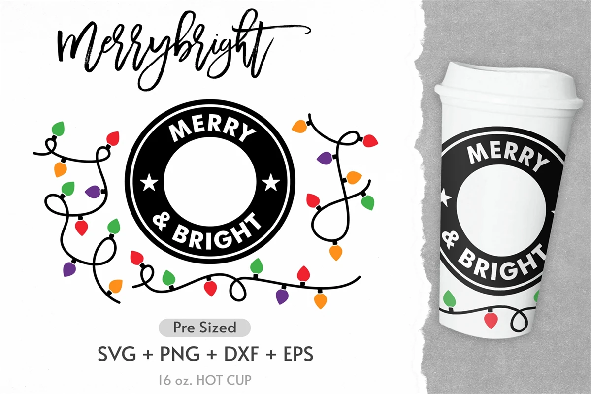 16oz Merry and Bright Starbucks Hot Cup Svg, Xmas Lights Svg
