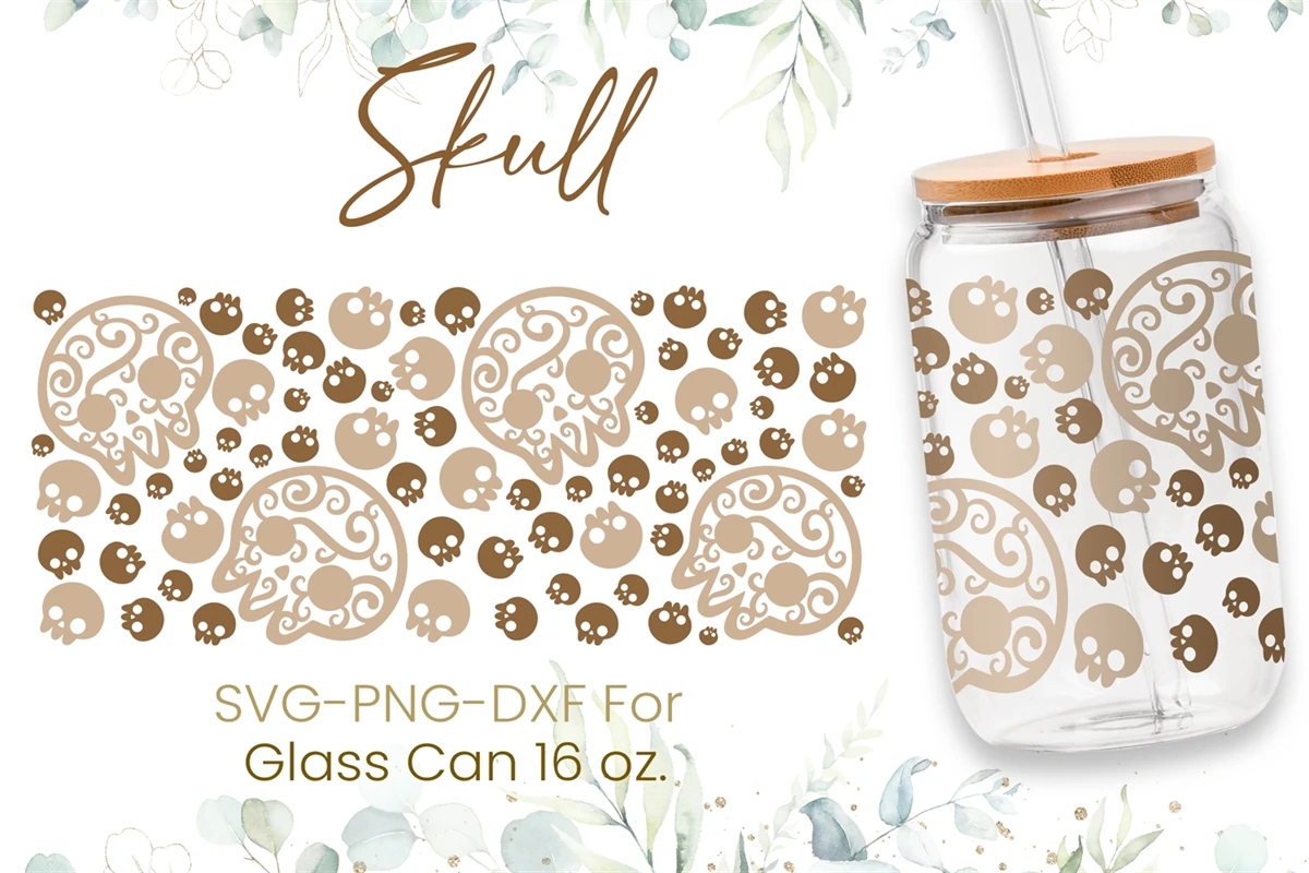 16oz Sugar Skull Libbey Glass Can Svg, Skulls Glass Can Wrap