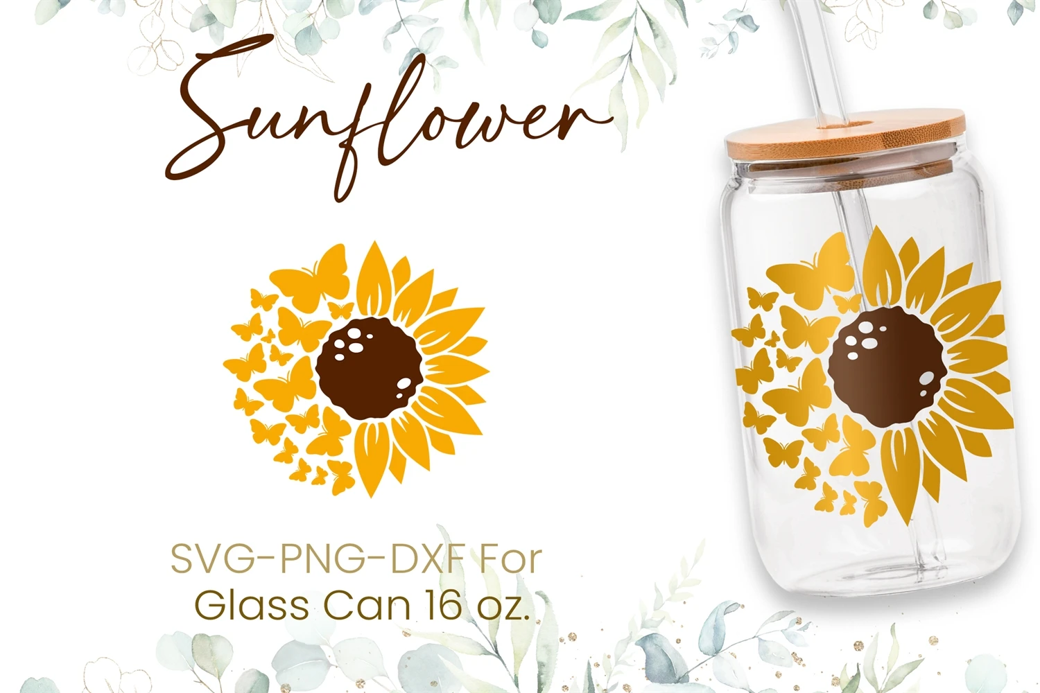 16oz Sunflower Libbey Glass Can Svg, Flower Svg, Butterfly