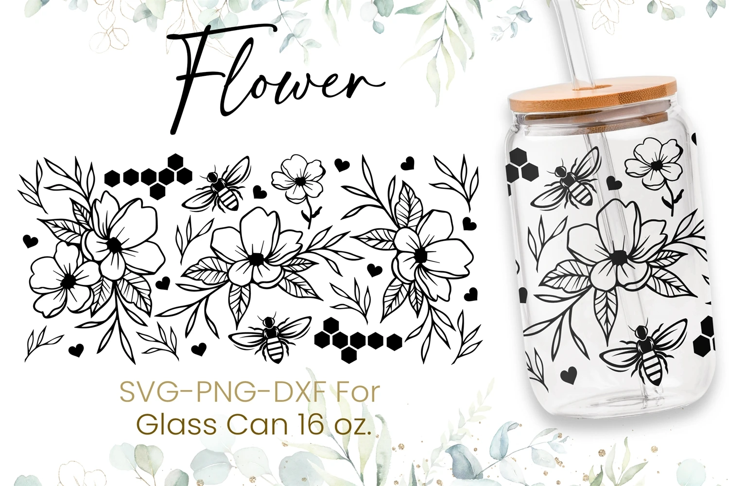 16oz Wild Flower Libbey Glass Can Svg, Bee Svg, ,Cricut File