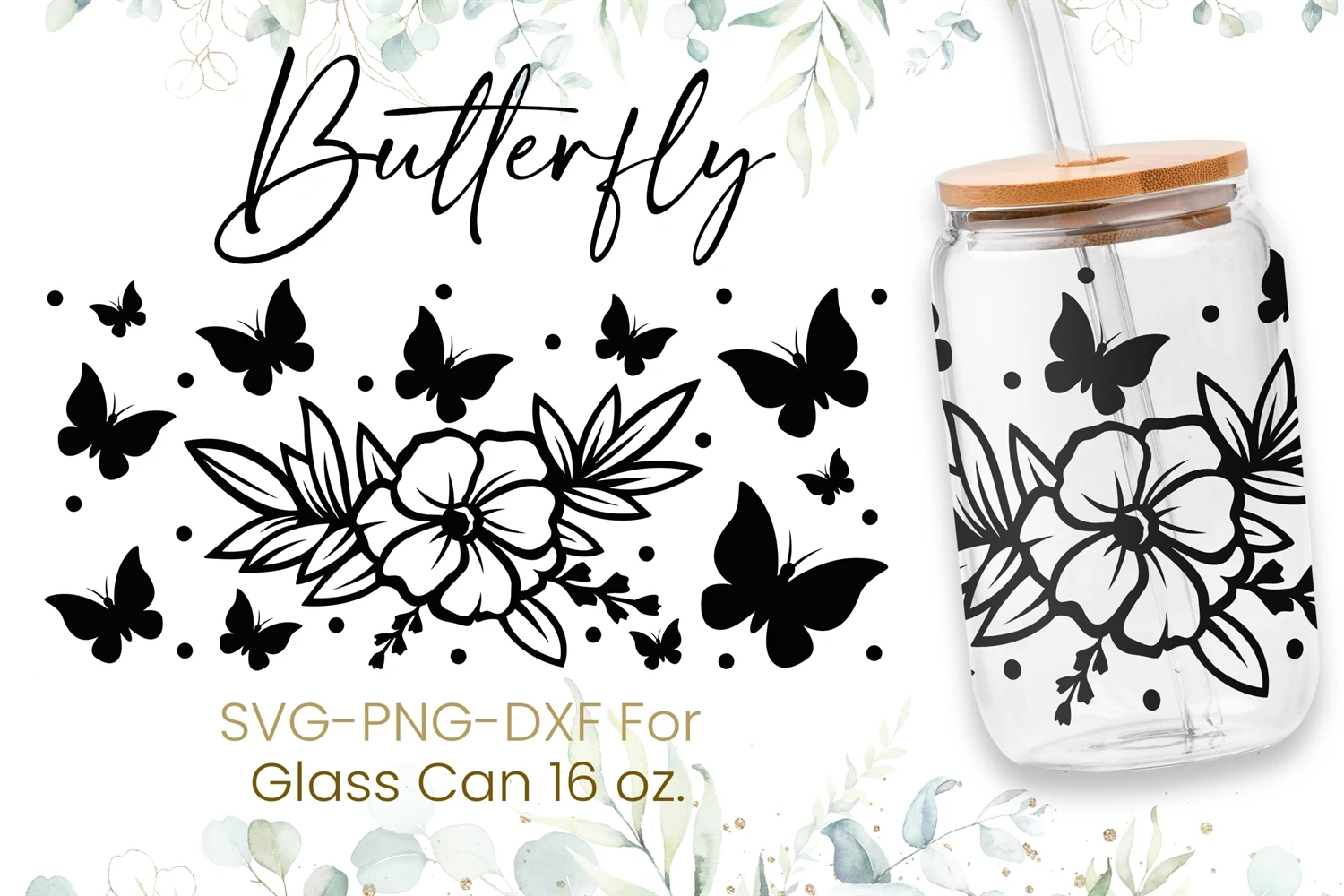 16oz Wild Flower Libbey Glass Can Svg, Flower, Butterfly Svg