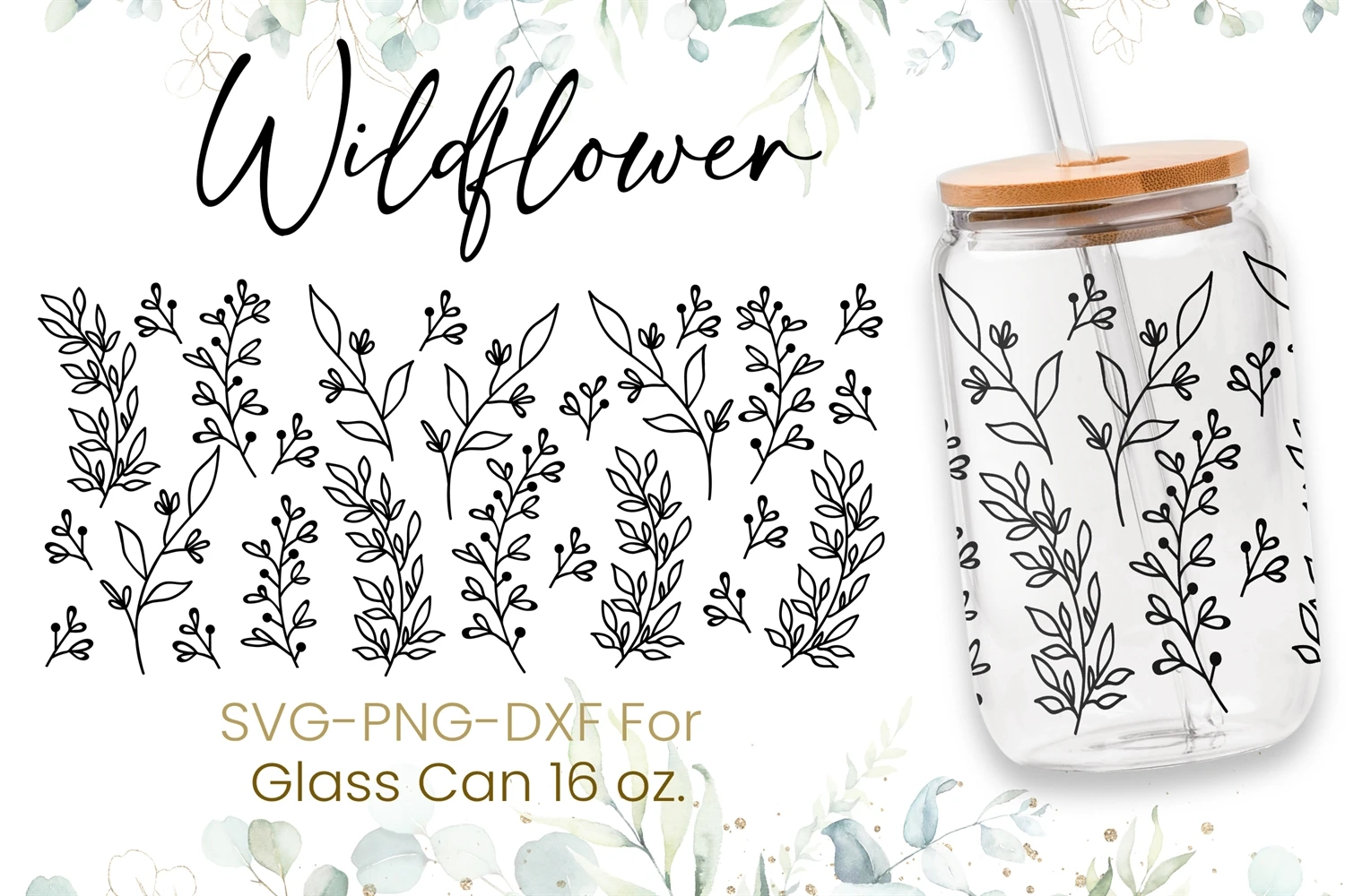 16oz Wildflower Libbey Glass Can Svg, Line Flower Svg, Png