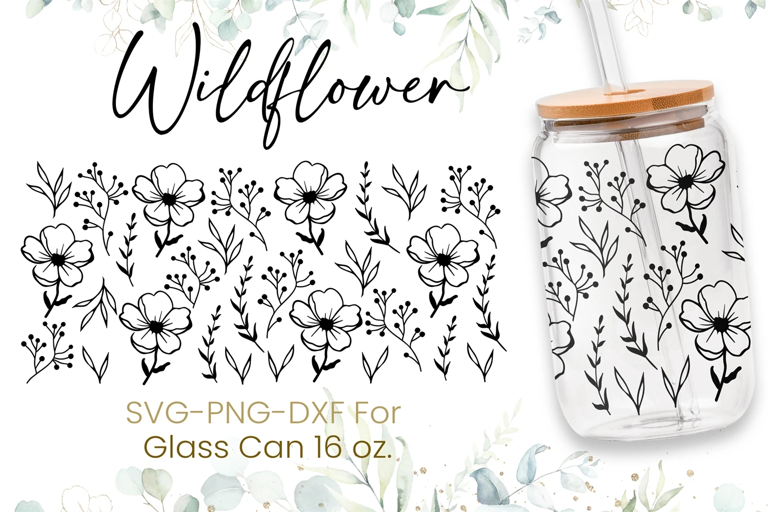 16oz Wildflower Libbey Glass Can Svg, Line Flower Svg, Png