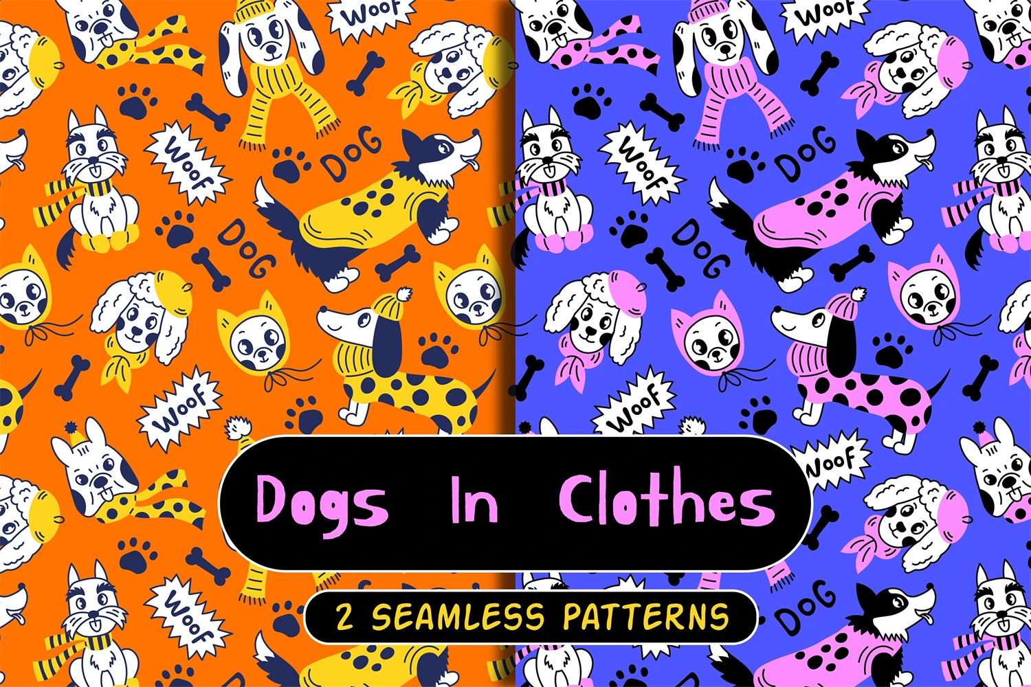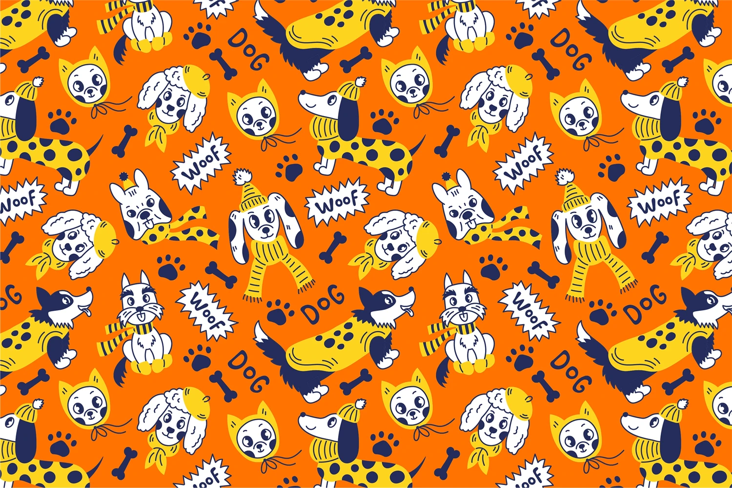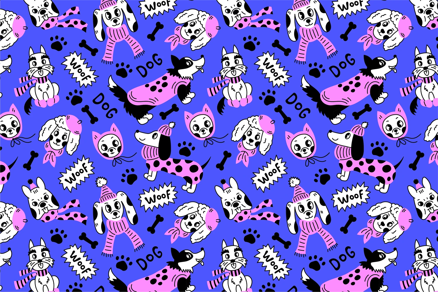 Funny doggy seamless patterns with comic dogs for autumn, fall and winter seasons. Various breeds (Dachshund, Chihuahua, Corgi, French bulldog, Poodle, Yorkshire terrier, Spaniel) in clothes, hat, scarf, sweater, boots, jacket, overalls with bones, test and paw prints. Modern fashion for pets. Colorful doodle style with vibrant colors and handwritten lettering. Vector illustration.