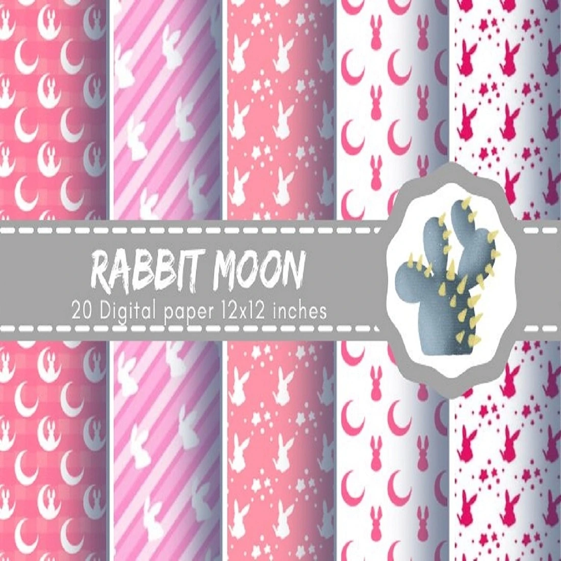 20 Rabbit Moon and Stars design digital paper, Pink theme