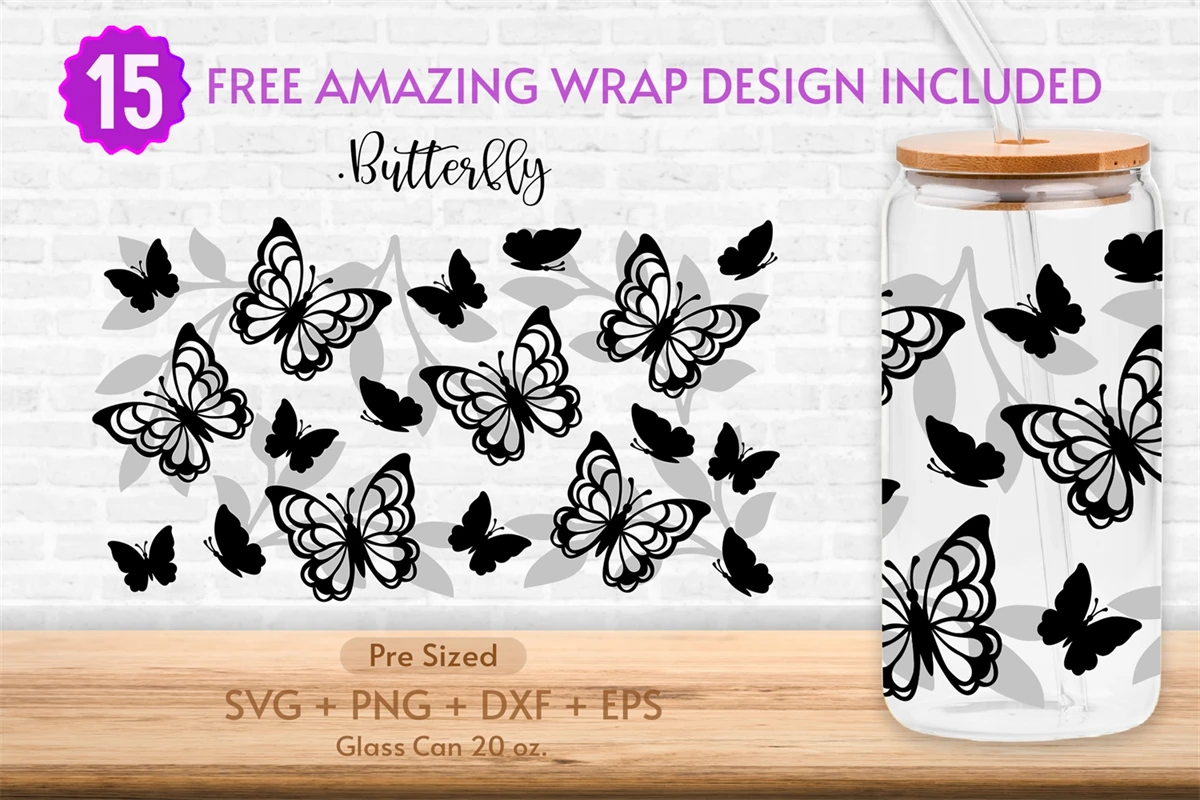 20oz Butterfly Libbey Glass Can Svg, Glass Can Full Wrap Svg