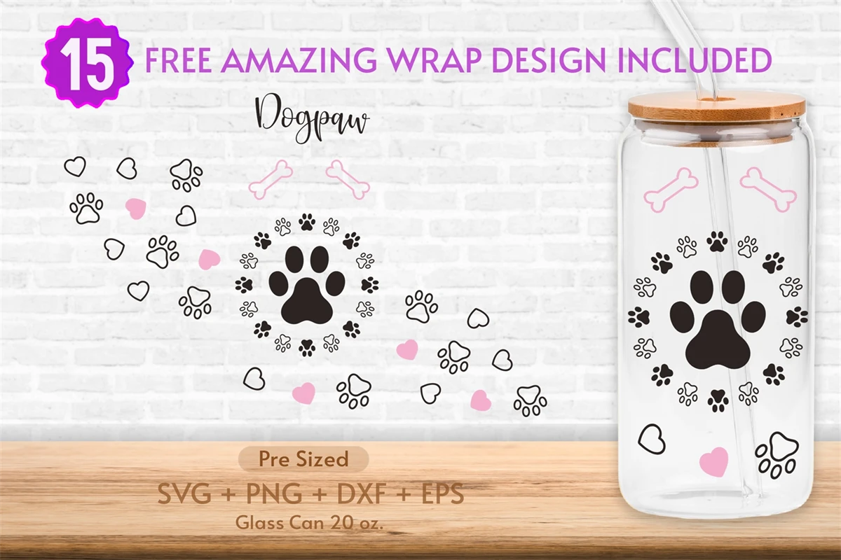 20oz Dog Pattern Libbey Glass Can Svg, Paw Prints Hearts