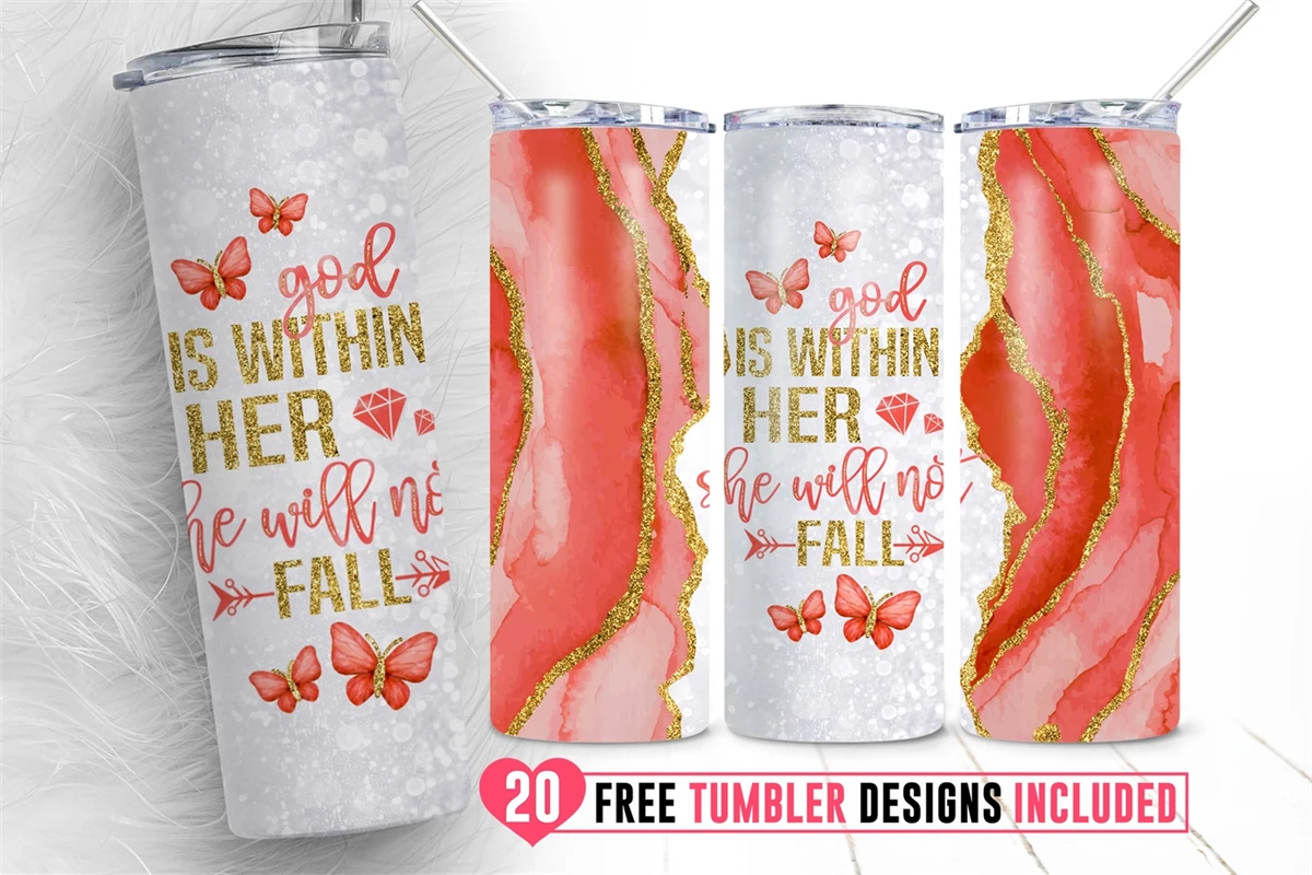 20oz God is Within Her She will not Fall Skinny Tumbler Png