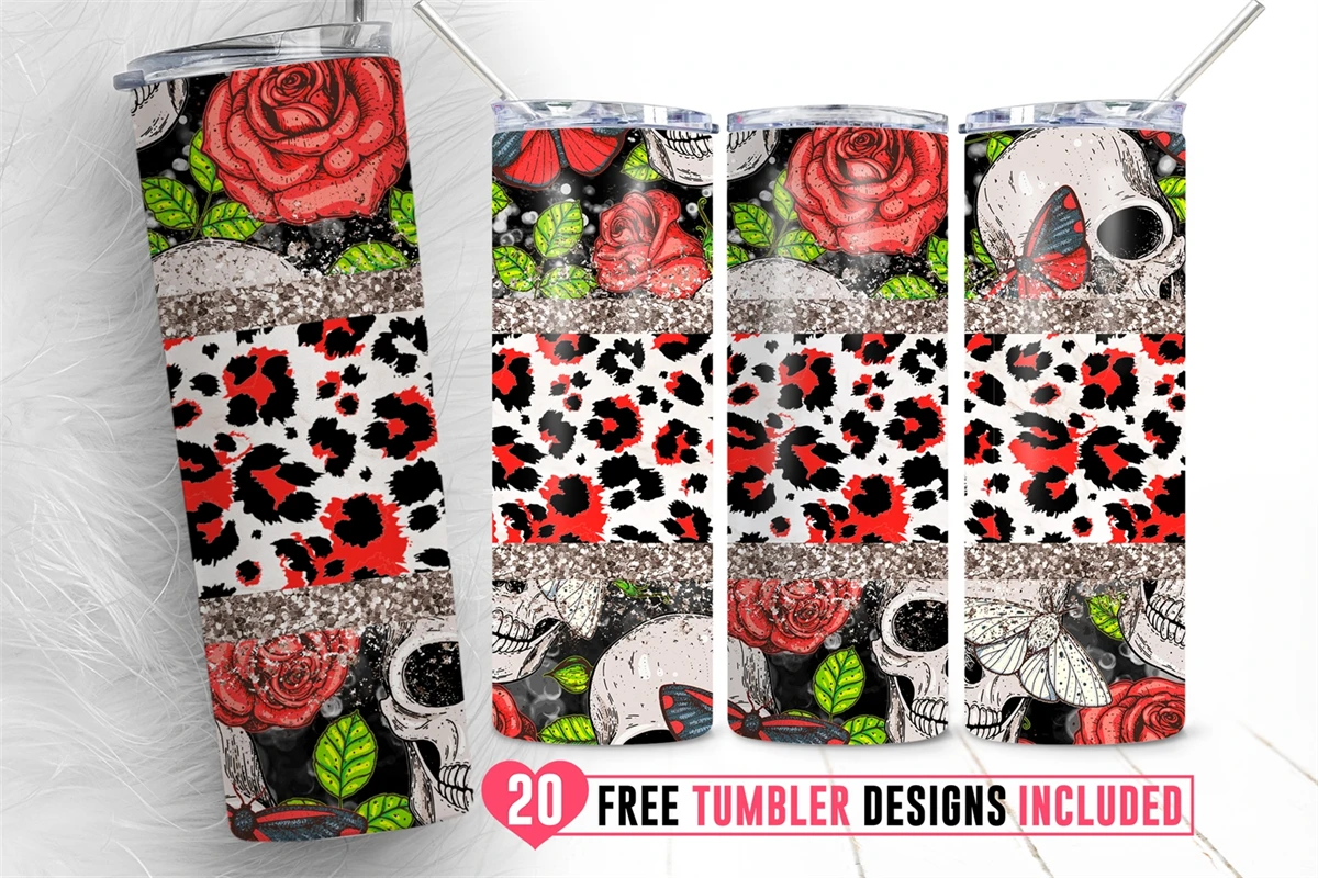 20oz Halloween Skinny Tumbler Sublimation Png, Flower, Skull