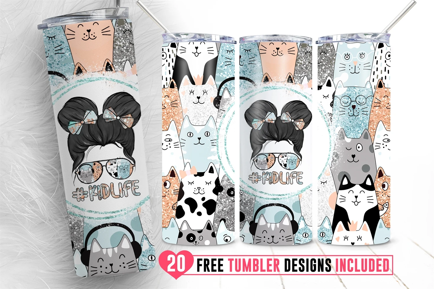 20oz Kid Life Messy Bun Skinny Tumbler Sublimation Png, Paw