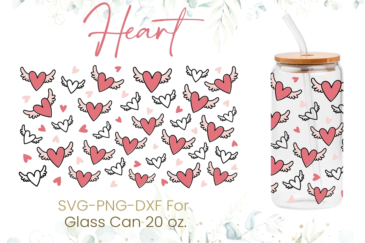 20oz Wing Heart Pattern Libbey Glass Can Svg, Love,Valentine