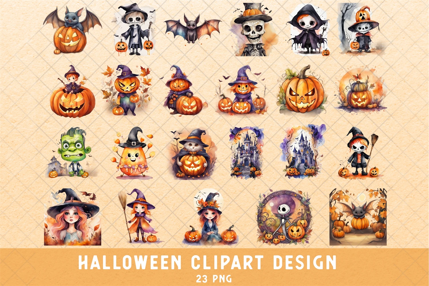 23 Halloween Clipart Bundle, Jack Png,Watercolor Witch,Ghost
