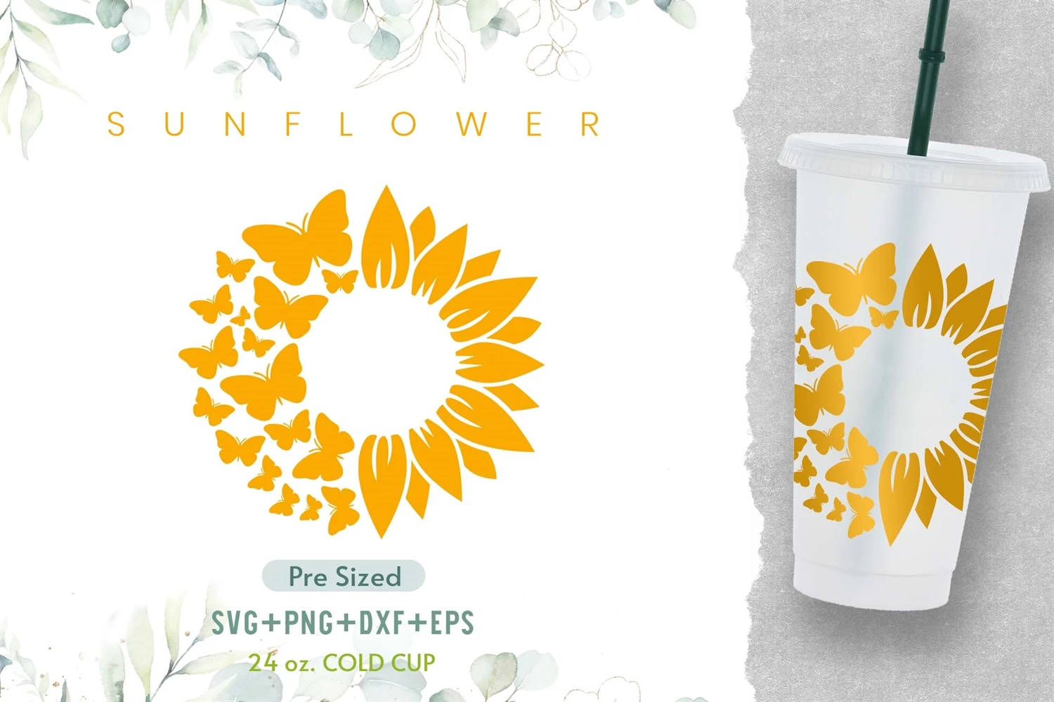 24oz Sunflower Starbucks Cold Cup Svg, Butterfly Svg, Flower
