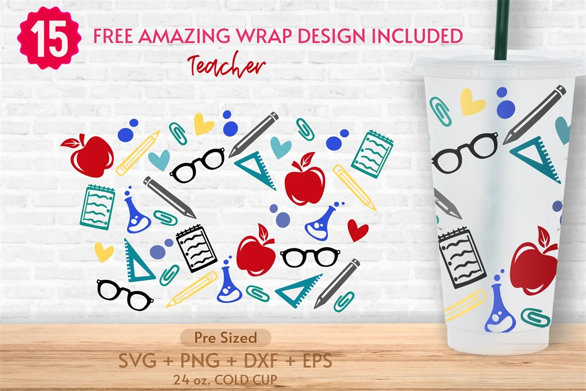 24oz Teacher Coffee Cold Cup Svg, Venti Full Wrap Svg, Apple