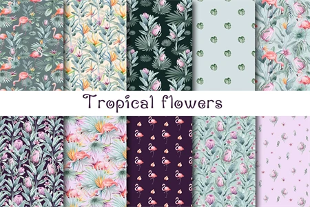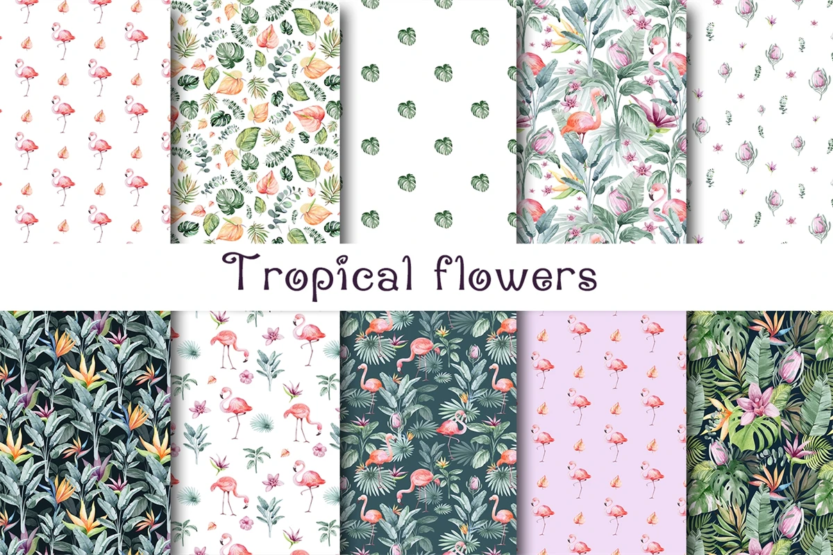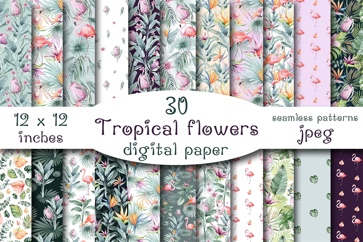 Clipart of seamless patterns of tropical flowers and plants. Perfect for wedding props, prom, scrapbooking, birthday invitations or any paper crafts. Each image is 12 x 12 inches (30.5 x 30.5 cm) and 300 dpi for the best print quality. They have a seamless format, making them perfect for large prints, fabrics or web backgrounds.