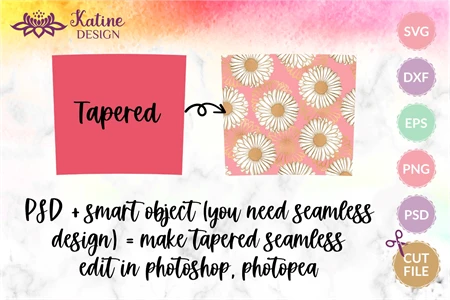- 2 PSD's straight and tapered (tapered template is with smart object). You will need seamless design to make tapered seamless design. Edit layer with smart object in Photoshop, Photopea (free online graphic program).