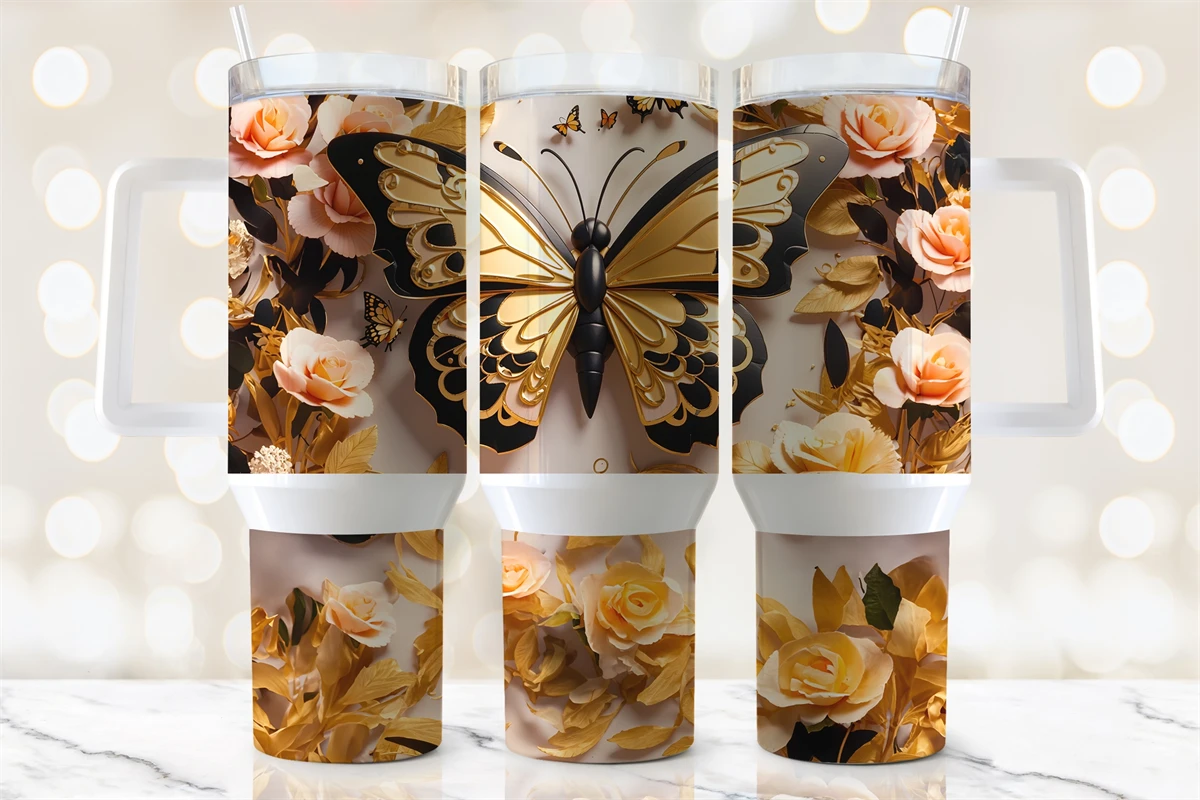 3D 40oz Golden Butterfly Floral Quencher Tumbler Wrap,Flower