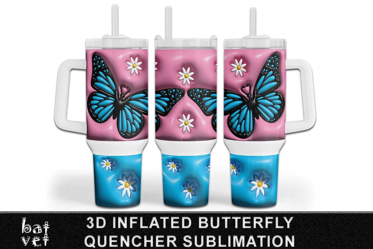 Butterfly Tumbler 40 Oz Quencher, Butterfly, Pink Bubble Wrap, Flowers, Cute Sublimation Wrap. Two Part Sublimation - Upper Straight and Lower Arched Print.