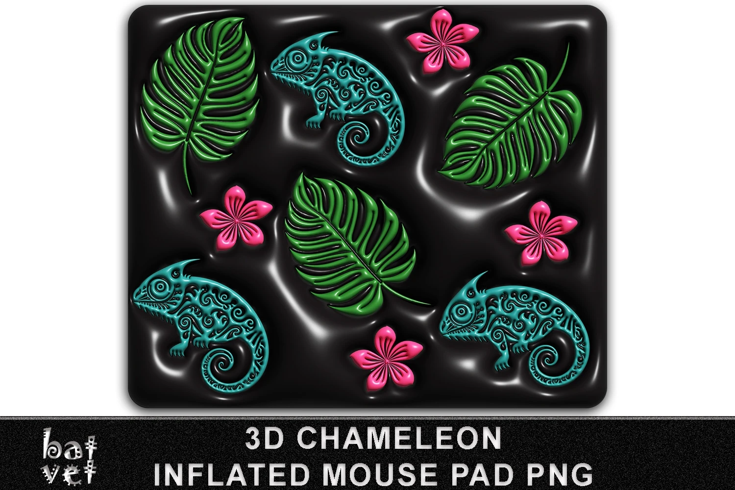 3D Inflated Mouse Pad Design, Chameleon, Frangipani, Tropical Leaves Sublimation Design.