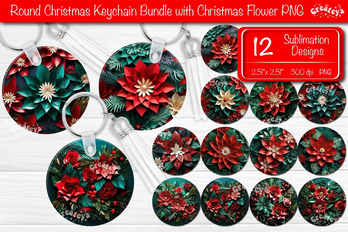 Christmas 3d keychain sublimation designs Bundle contains 12 designs with Christmas Flower Poinsettia print Round Keychain PNG. Christmas Sublimation Round Keychain Perfect as a delightful gift.