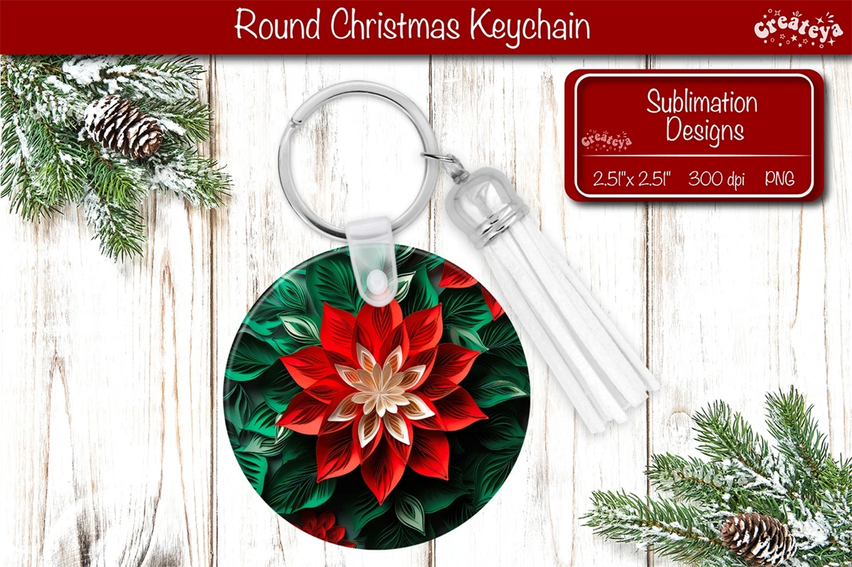 Christmas 3d keychain sublimation designs with Christmas Flower Poinsettia print Round Keychain PNG. Christmas Sublimation Round Keychain Perfect as a delightful gift.