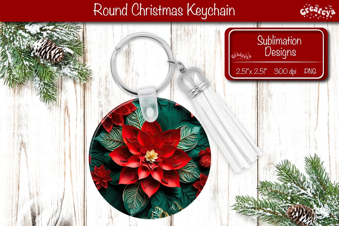Christmas 3d keychain sublimation designs with Christmas Flower Poinsettia print Round Keychain PNG. Christmas Sublimation Round Keychain Perfect as a delightful gift.