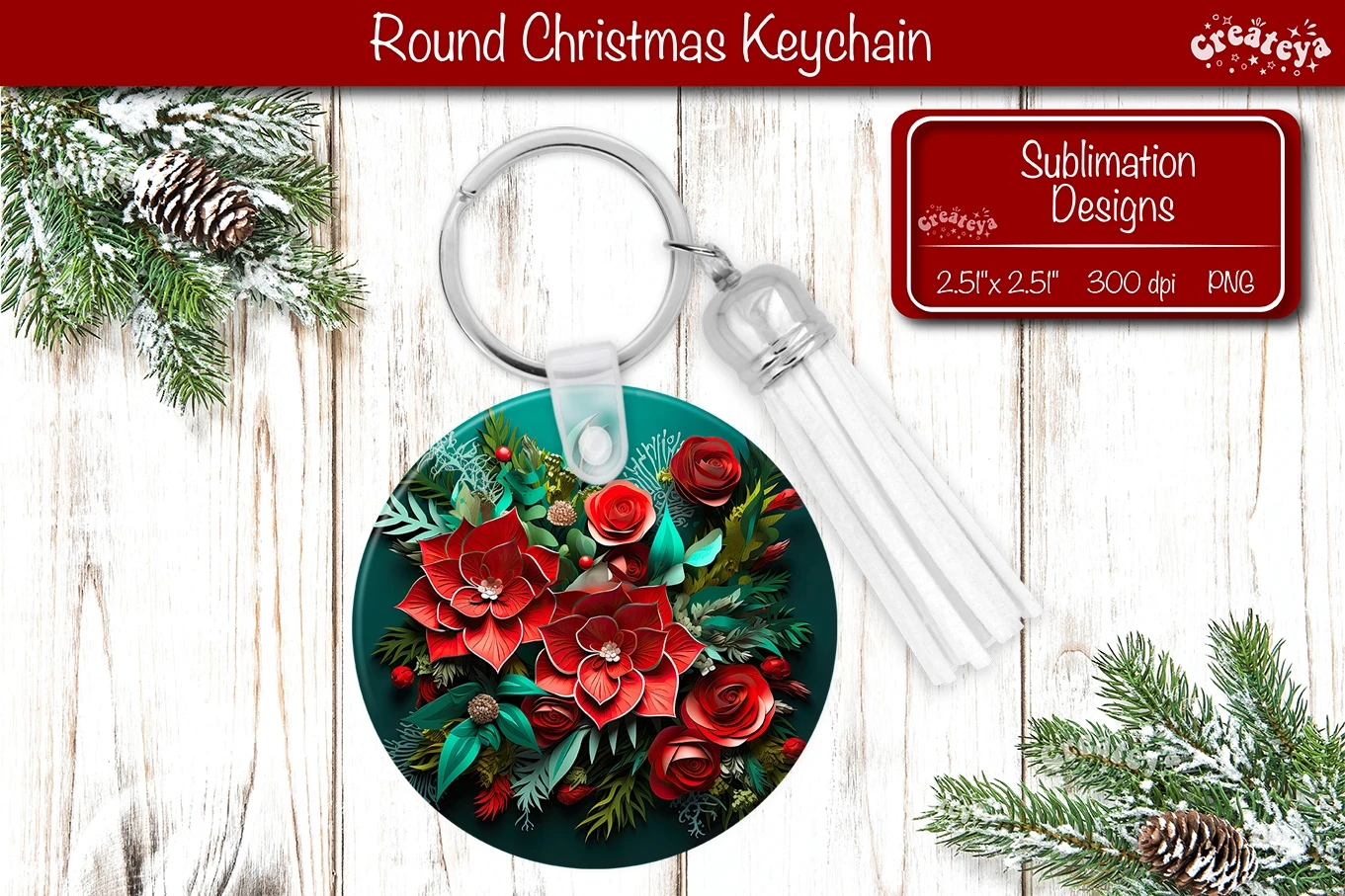 Christmas 3d keychain sublimation designs with Christmas Flower Poinsettia print Round Keychain PNG. Christmas Sublimation Round Keychain Perfect as a delightful gift.
