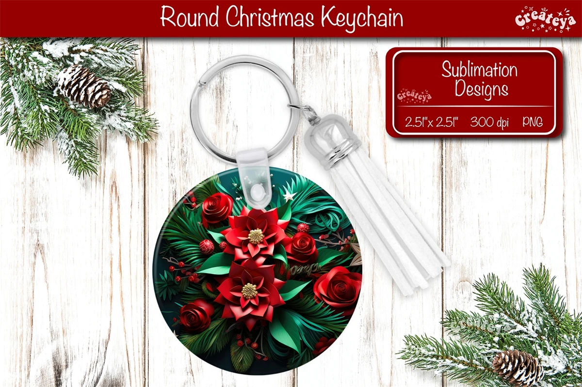 Christmas 3d keychain sublimation designs with Christmas Flower Poinsettia print Round Keychain PNG. Christmas Sublimation Round Keychain Perfect as a delightful gift.