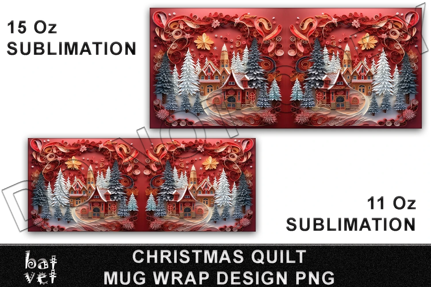 11 Oz Mug Wrap and 15 Oz Mug Design, 3D Paper Quilling Christmas Eve Sublimation for Mug Print.