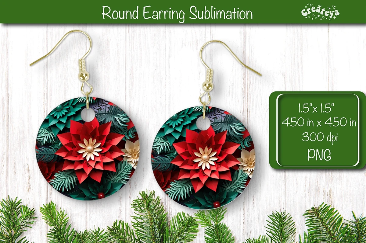 3D Christmas Round Earring Sublimation Design with 3D Christmas Flowers. Express your individuality, elevate your mood, and spread joy with these earrings. They also make a perfect gift for any occasion. Embrace your unique style and let the Christmas Earrings be your artistic expression!