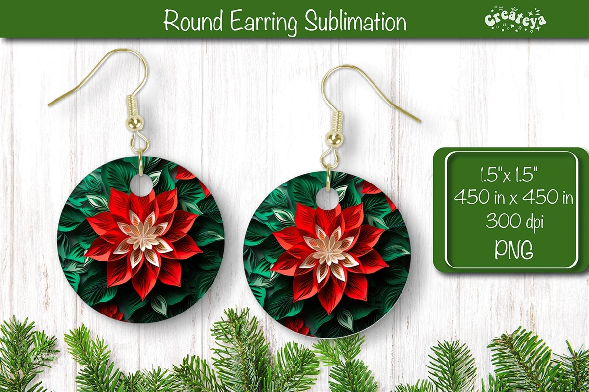 3D Christmas Round Earring Sublimation Design with 3D Christmas Flowers. Express your individuality, elevate your mood, and spread joy with these earrings. They also make a perfect gift for any occasion. Embrace your unique style and let the Christmas Earrings be your artistic expression!