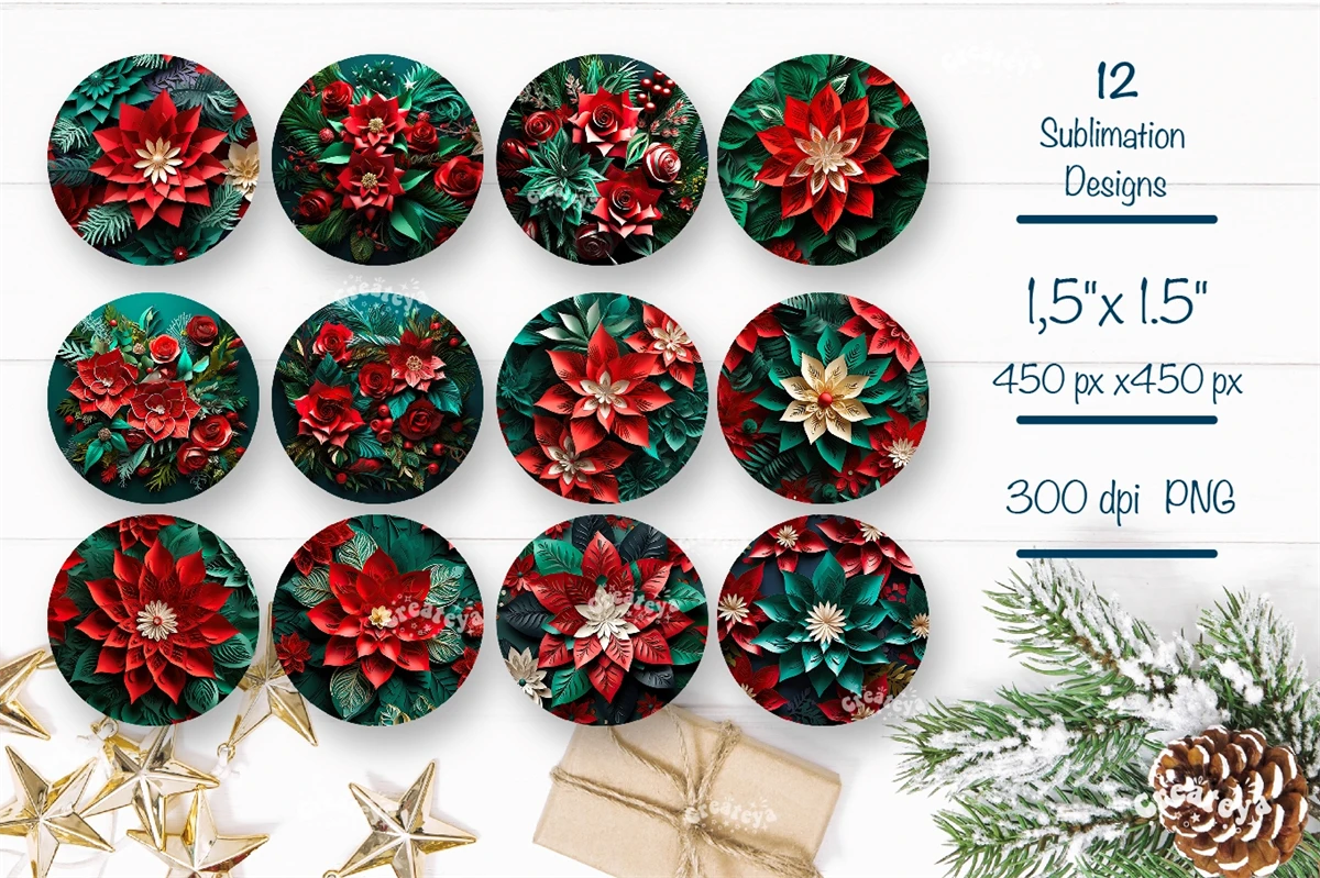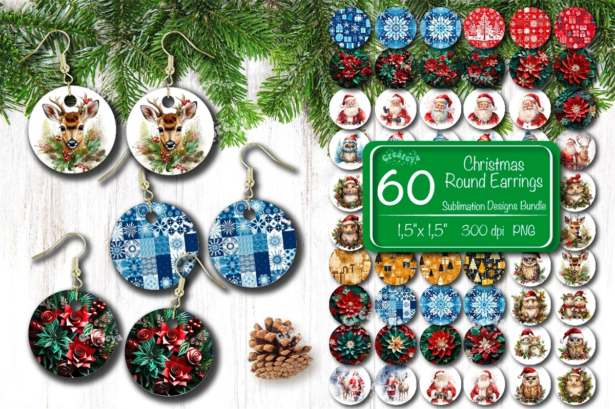 3D Christmas Round Earring Sublimation Design with 3D Christmas Flowers, Christmas baby animals includes 60 designs. Express your individuality, elevate your mood, and spread joy with these earrings. They also make a perfect gift for any occasion. Embrace your unique style and let the Christmas Earrings be your artistic expression!