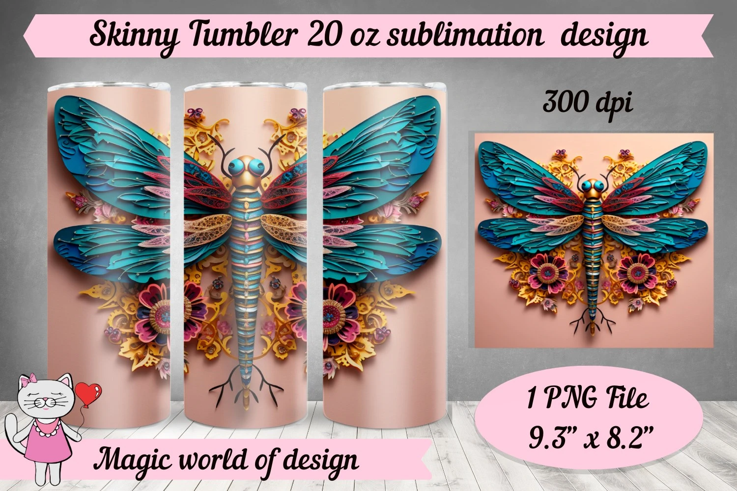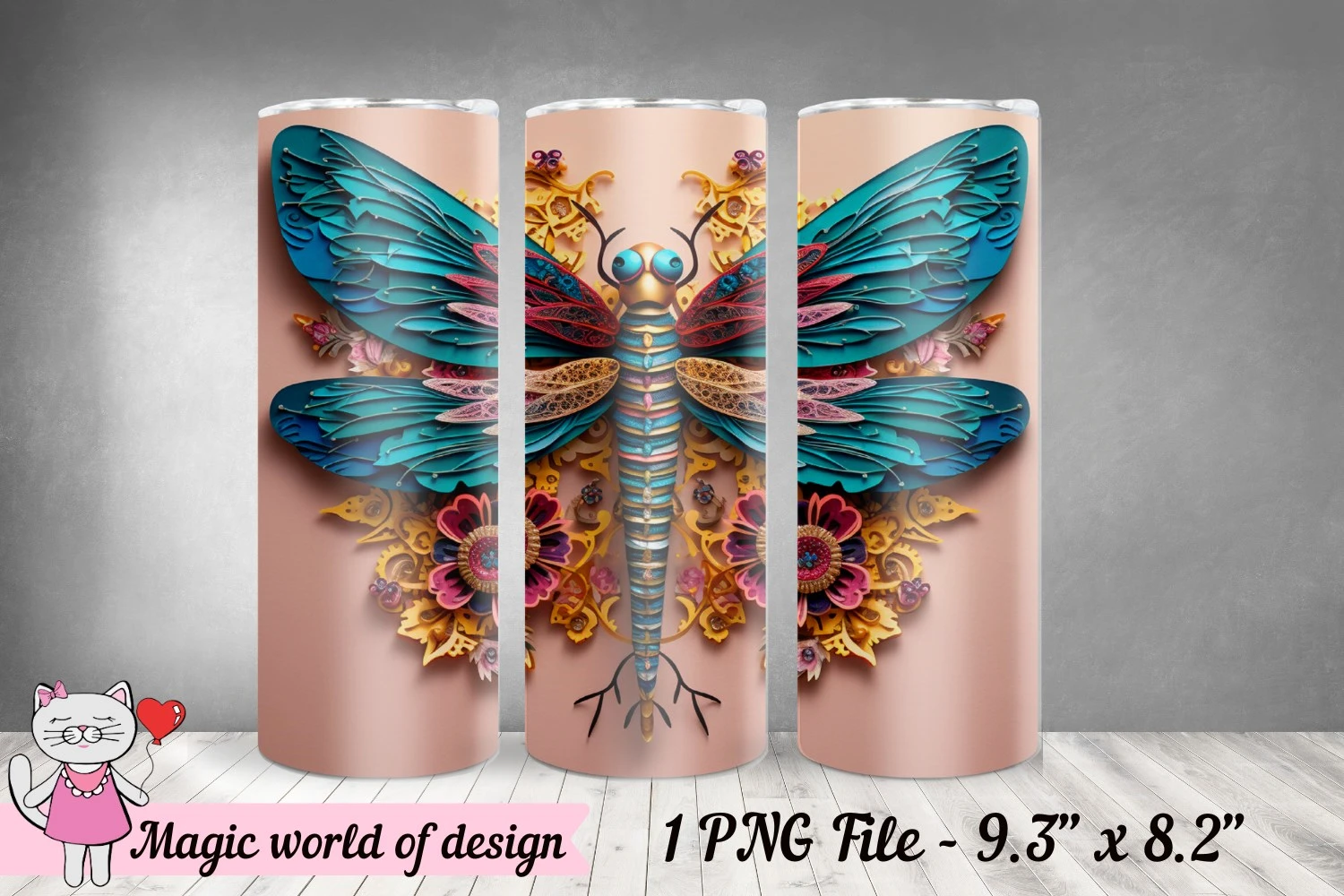 3D Dragonfly design For 20 oz Skinny Tumbler Png
