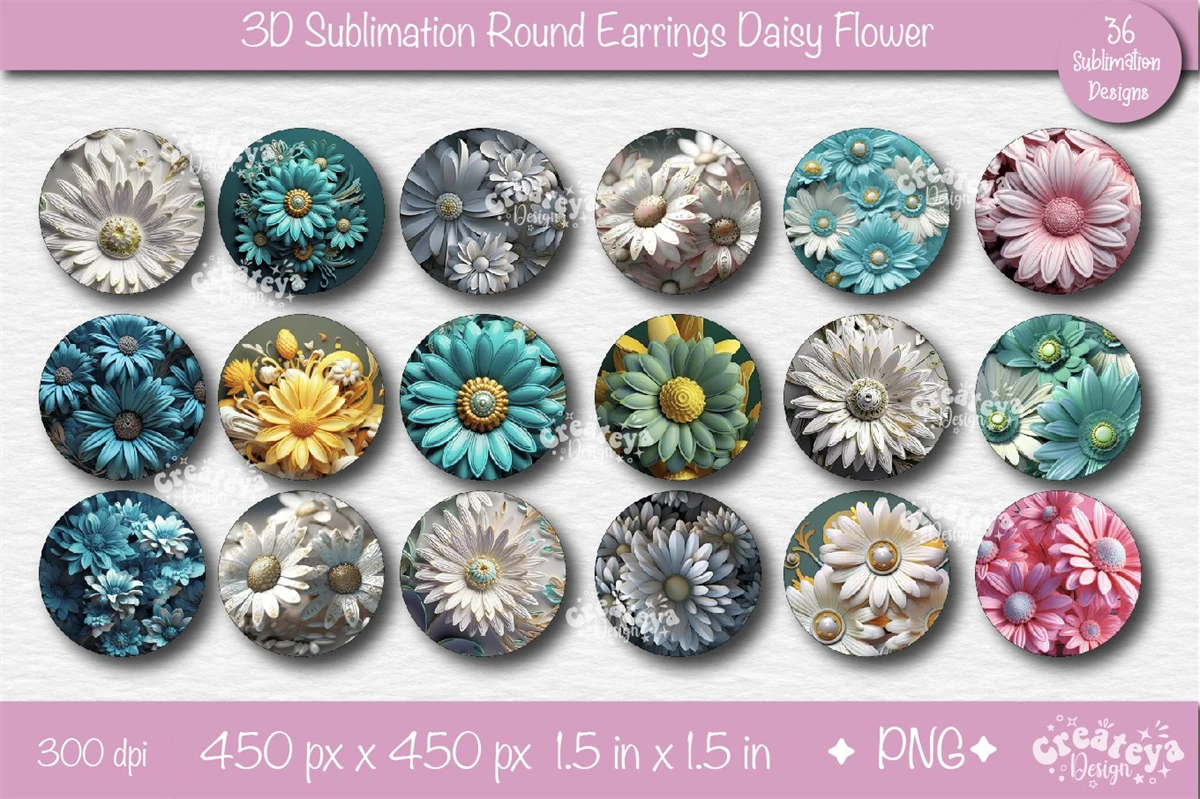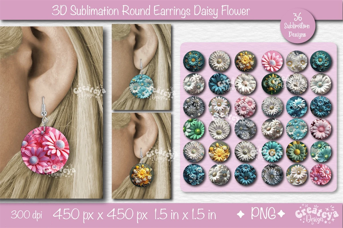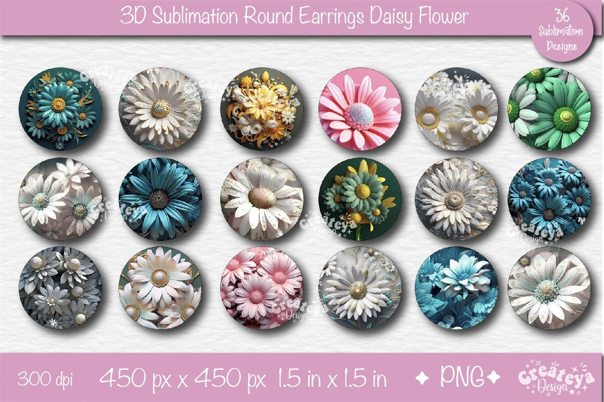 3D earring Round sublimation bundle with 3D Daisy perfect for summer earrings. Round earring sublimation bundle PNG contains 36 earring designs.