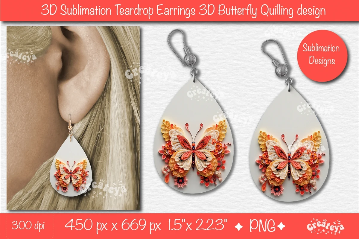 3D earring Teardrop sublimation with 3D Butterfly sublimation In Quilling paper style is perfect for summer teardrop earrings. Teardrop earring sublimation PNG. Cute earrings Design, Teardrop earring sublimation PNG Tear Drop Earring Printable Instant Download.