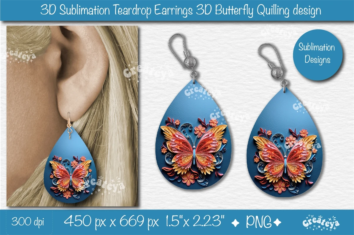 3D earring Teardrop sublimation with 3D Butterfly sublimation In Quilling paper style is perfect for summer teardrop earrings. Teardrop earring sublimation PNG. Cute earrings Design, Teardrop earring sublimation PNG Tear Drop Earring Printable Instant Download.