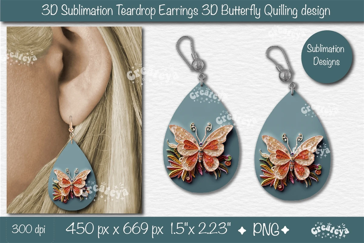 3D earring Teardrop sublimation with 3D Butterfly sublimation In Quilling paper style is perfect for summer teardrop earrings. Teardrop earring sublimation PNG. Cute earrings Design, Teardrop earring sublimation PNG Tear Drop Earring Printable Instant Download.