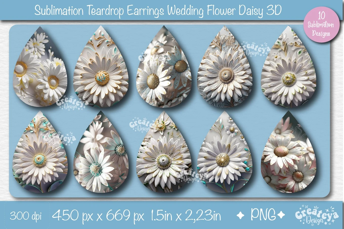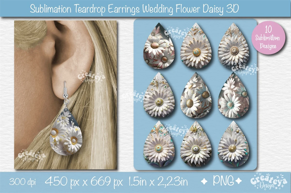 3D earring Teardrop sublimation bundle with 3D Daisy perfect for Wedding Floral sublimation for Bridesmaid teardrop earrings. Teardrop earring sublimation bundle PNG contains 10 teardrop earring designs.