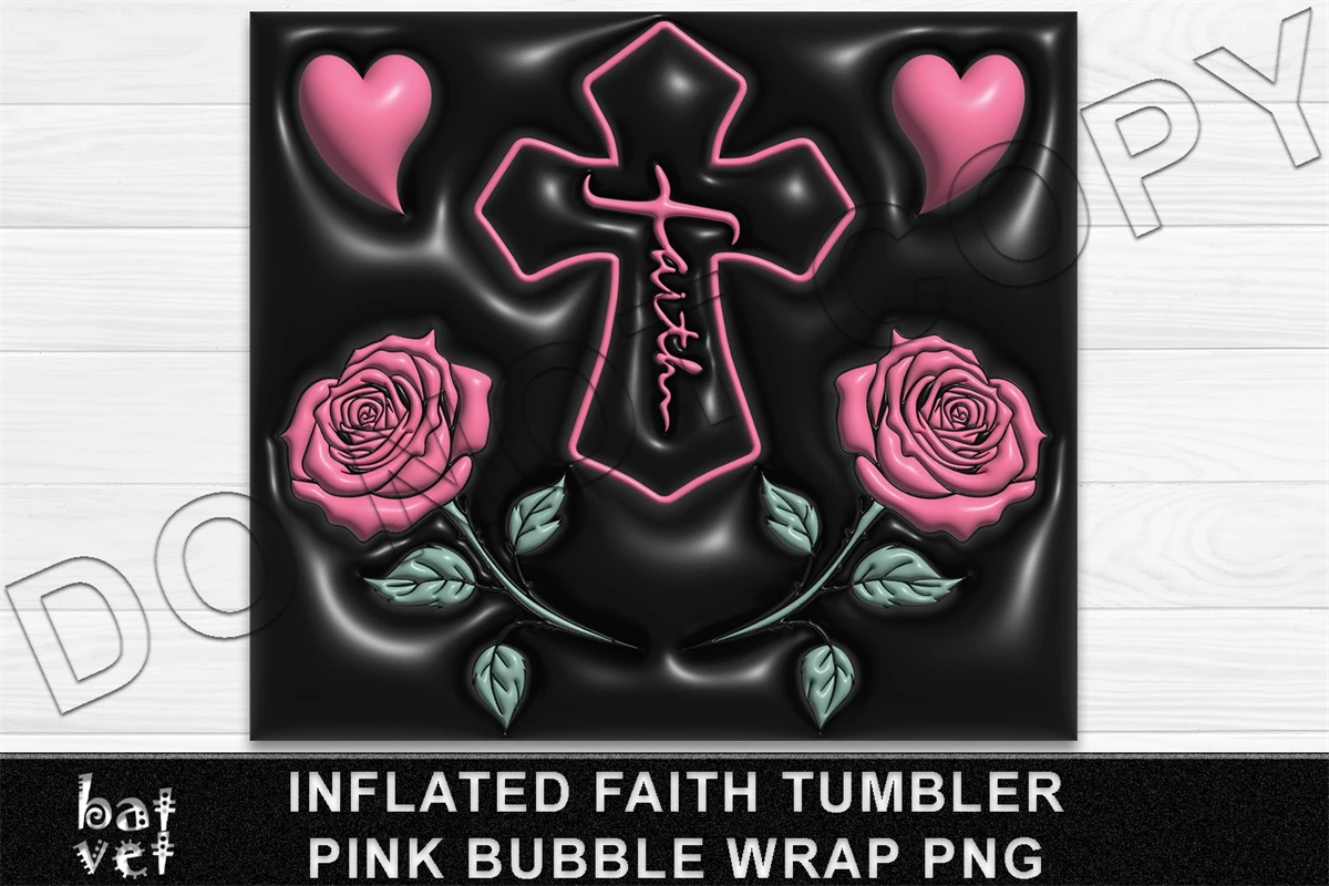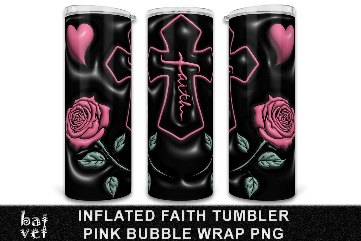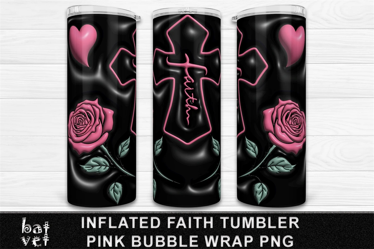 3D Inflated 20 Oz Tumbler, Puffy Bubble Wrap Faith, Christian Cross, Pink Roses, Pink Hearts Sublimation Wrap.
