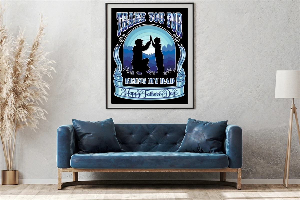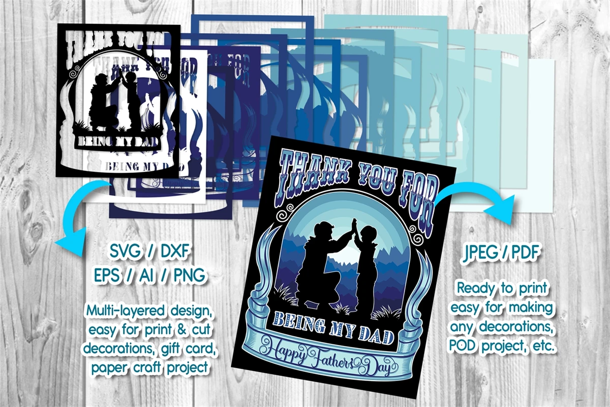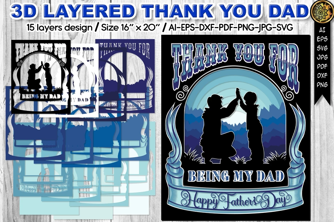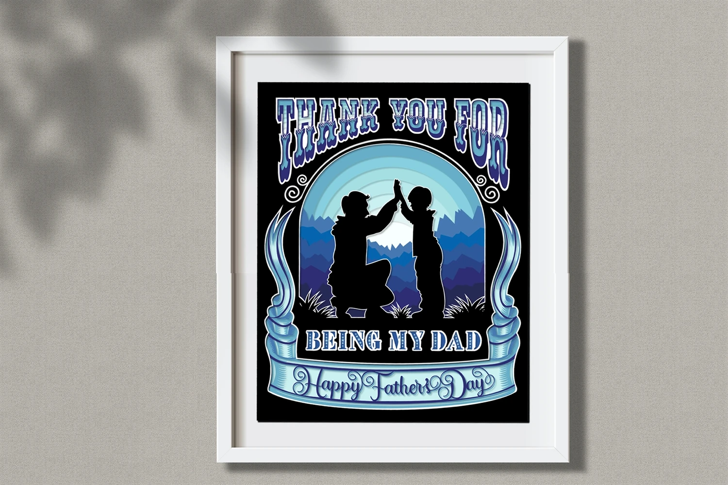 3D Father's Day Gift Multi-layered Design Thank You DAD Papercut SVG Clipart in Blue & Black Tone color for your creative DIY projects, and gift ideas for Father's Day. Perfect for papercut, scrapbooking, card stock, home decor, and other DIY projects. Options are endless!