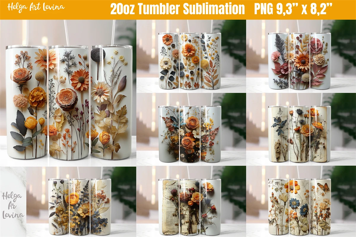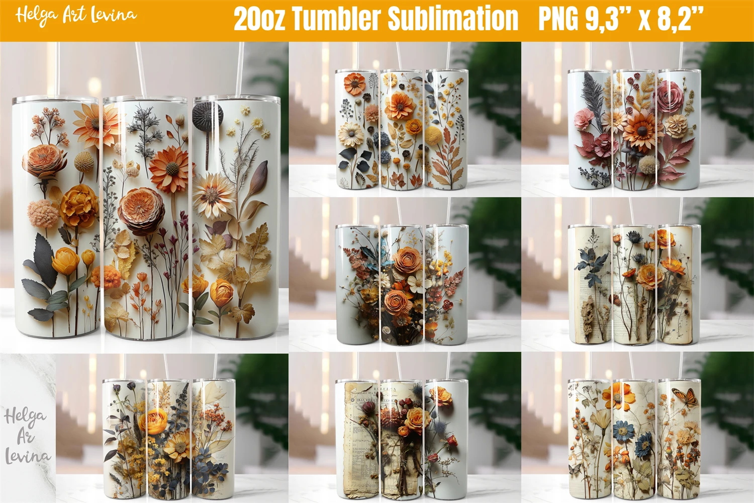 3D Flower 20 OZ Skinny Tumbler Sublimation Bundle, Herbarium PNG