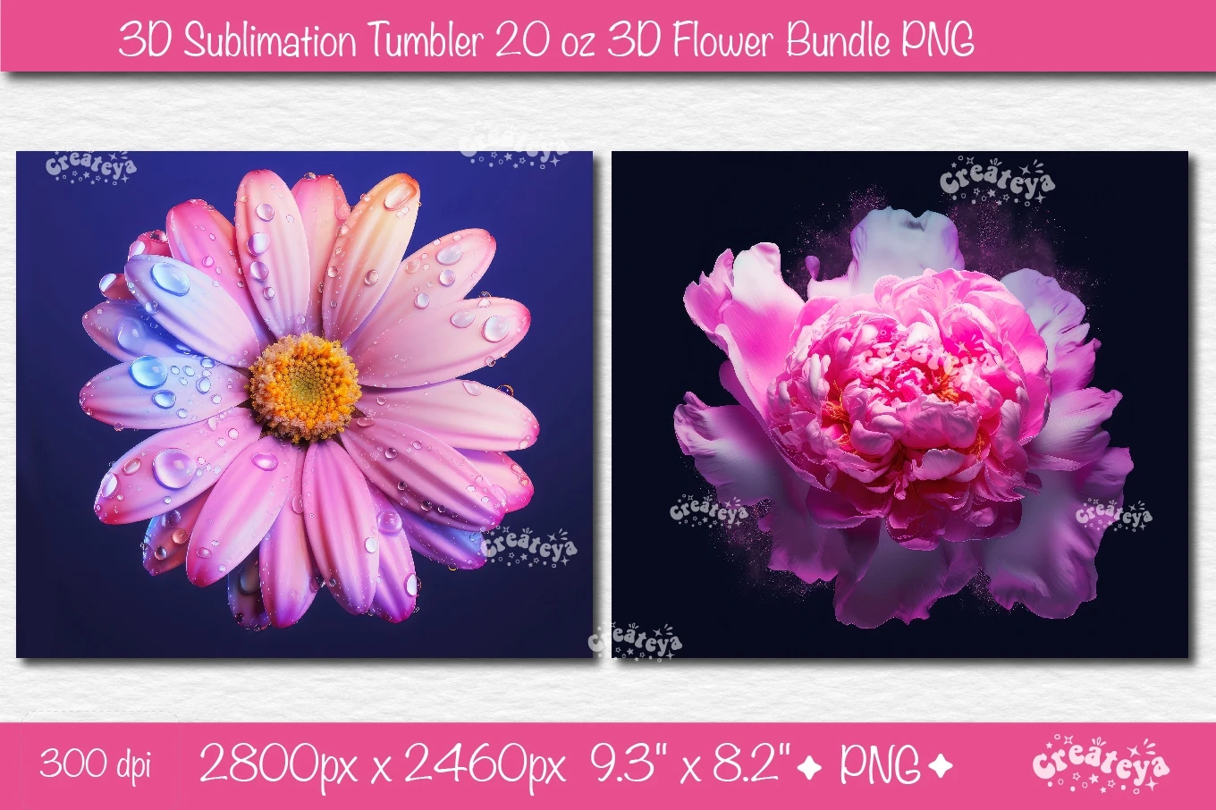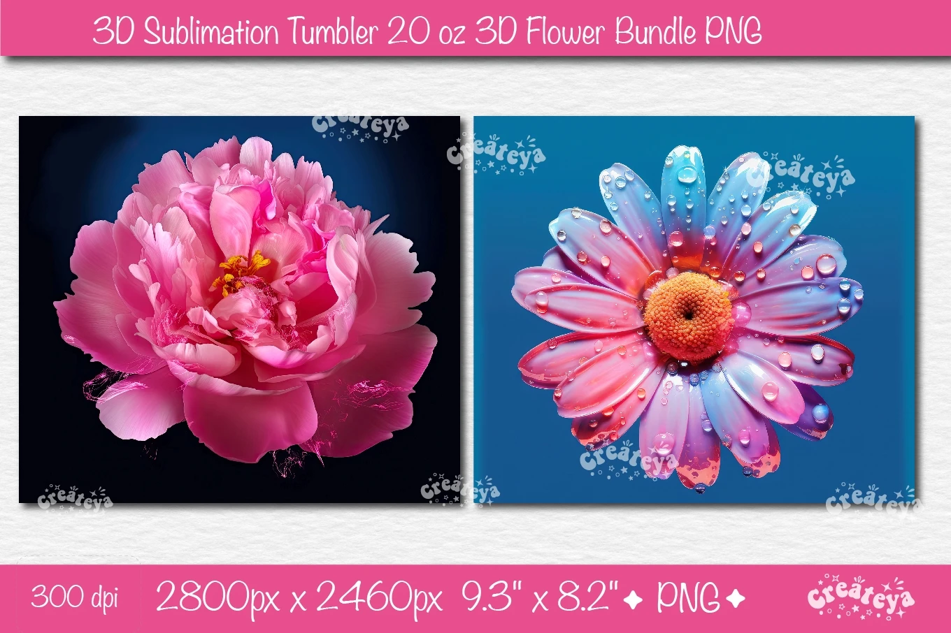 3D Flower Tumbler wrap Bundle sublimation with 3D Flower Pink Peony and 3D Daisy Tumbler 20 Oz skinny sublimation design PNG.