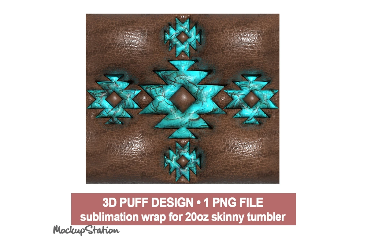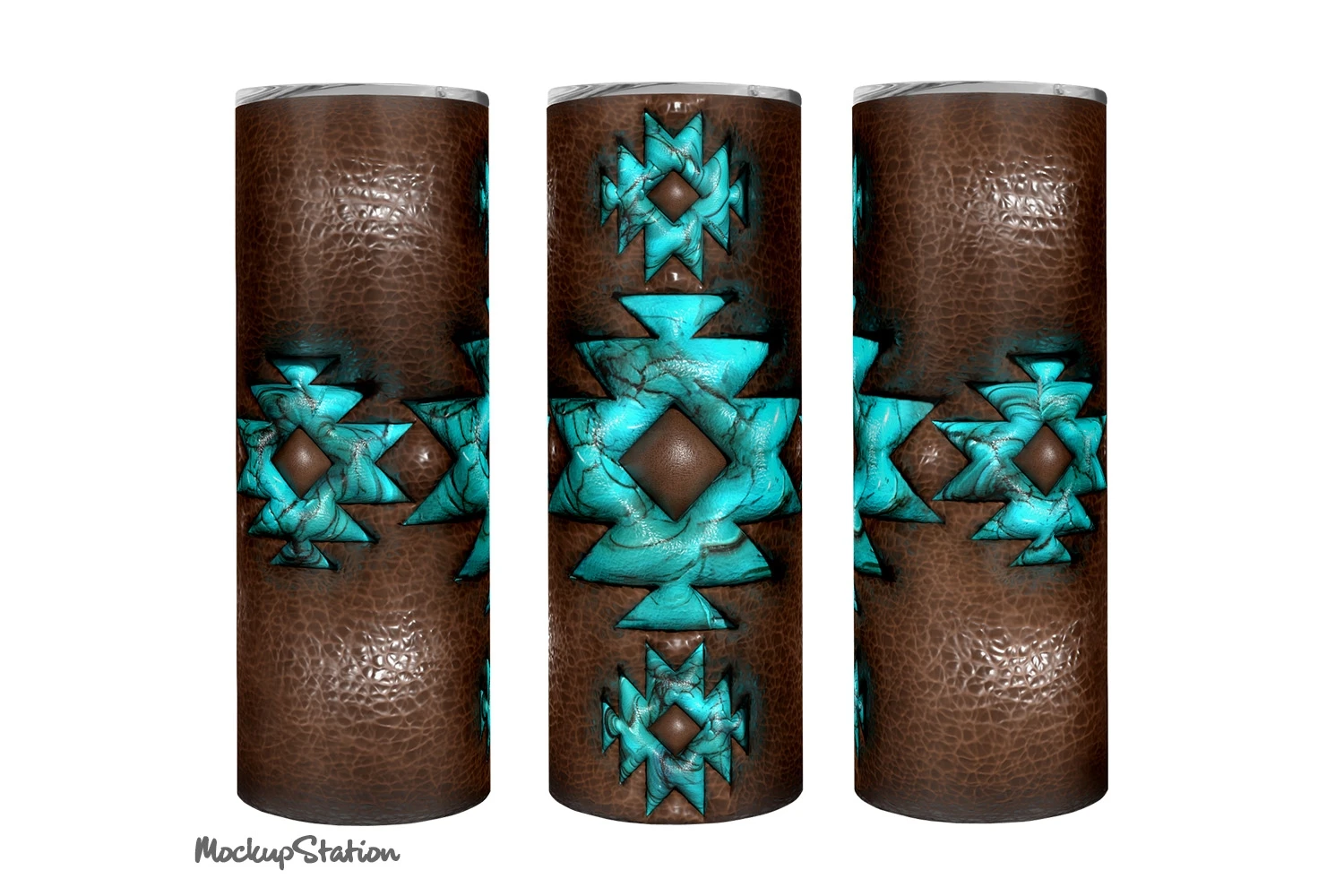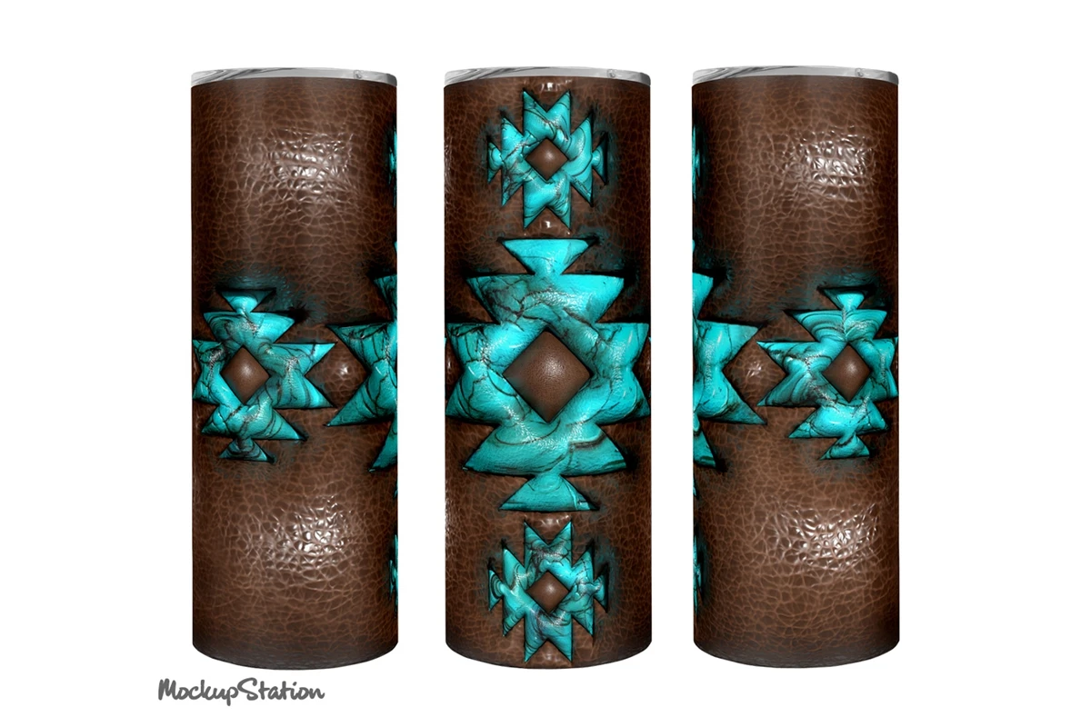 3D Inflated Puffy Western Tumbler Wrap, Puff Turquoise and Leather Design Sublimation PNG, 20oz Skinny Digital Download