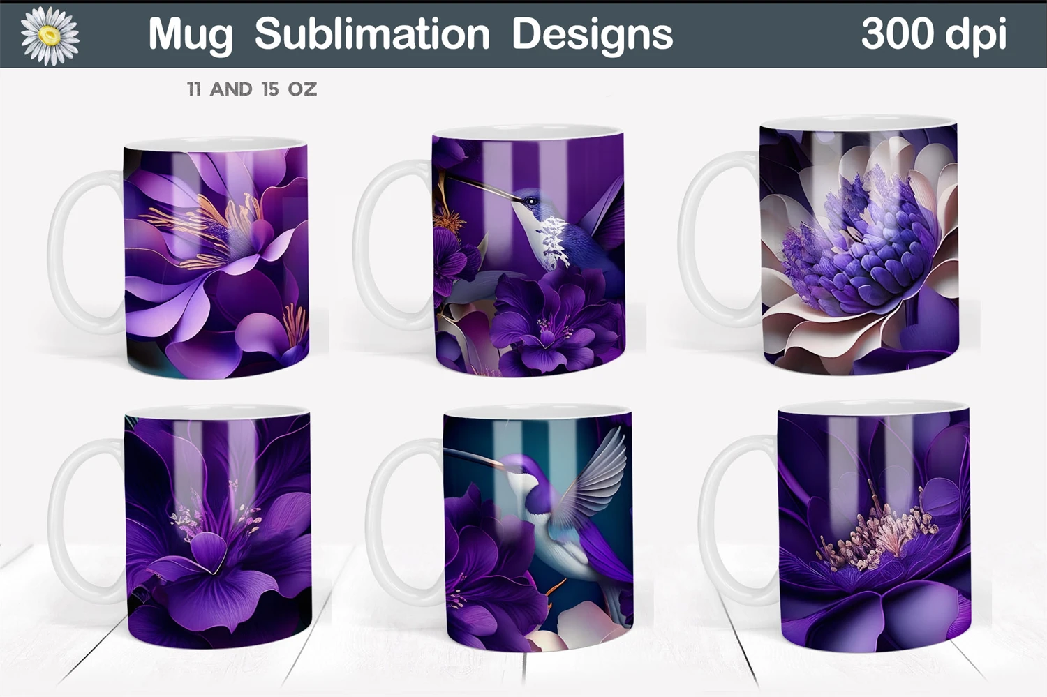 3D Purple Flowers Mug Wrap. Hummingbird Mug Sublimation