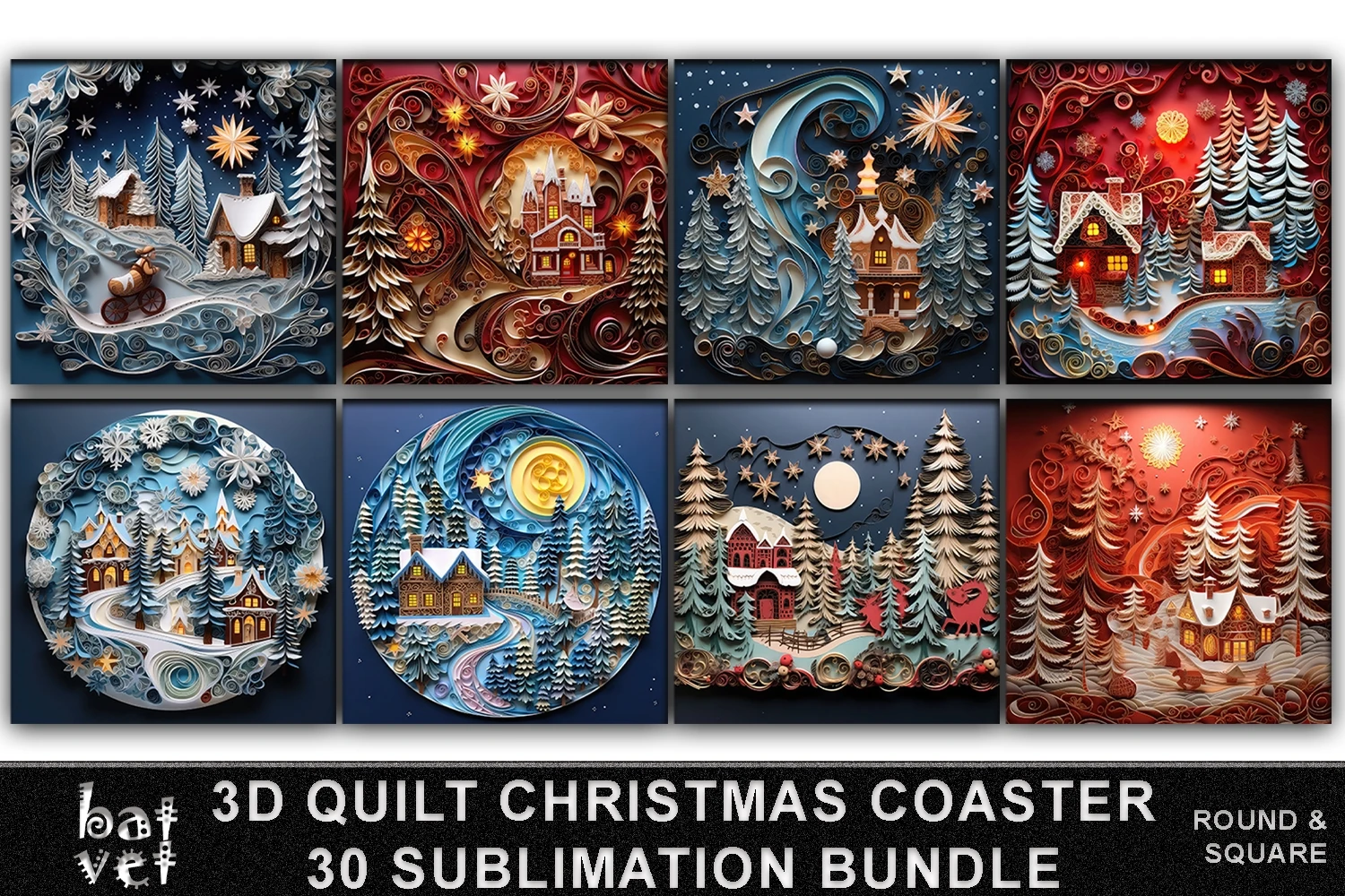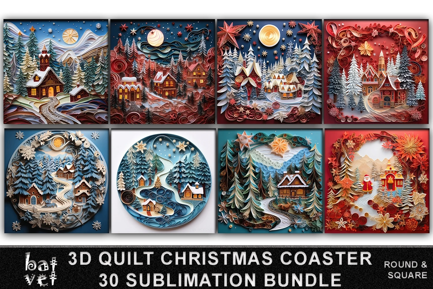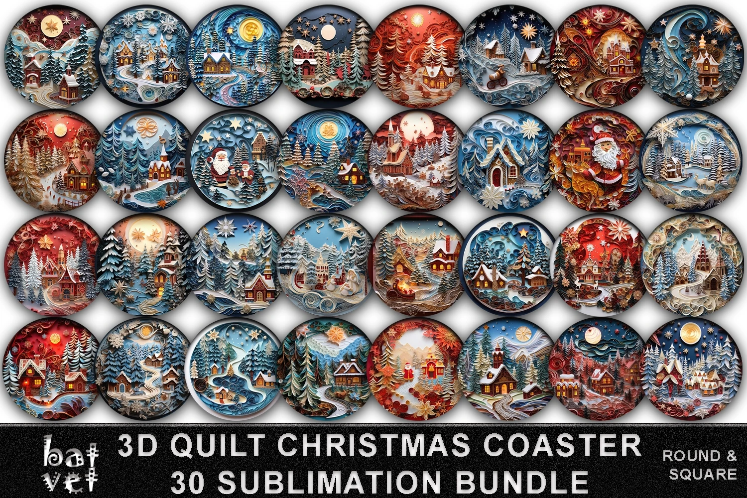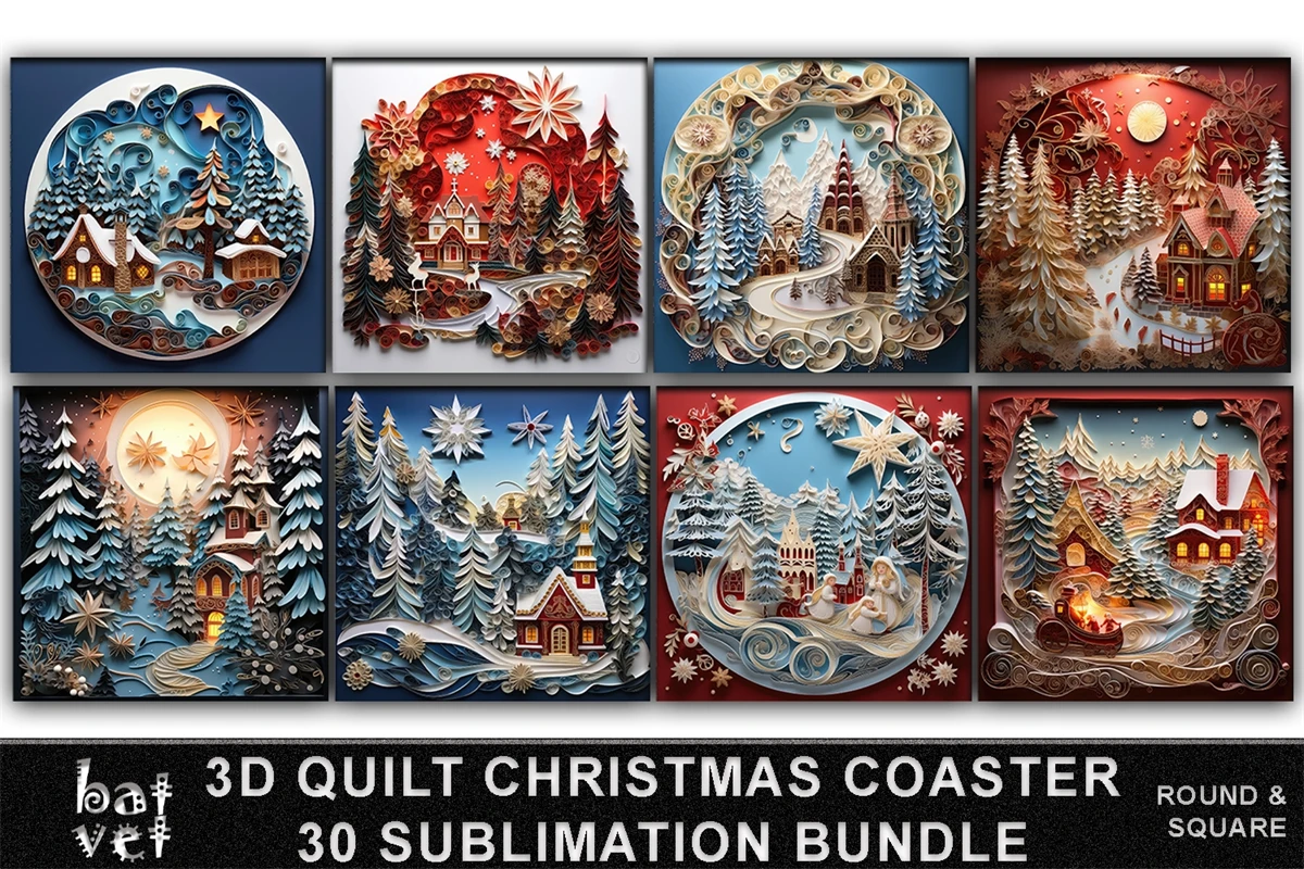 3D Quilt Christmas Coaster Sublimation Bundle PNG / 3D Christmas Car Coaster Sublimation / 30 PNG Designs